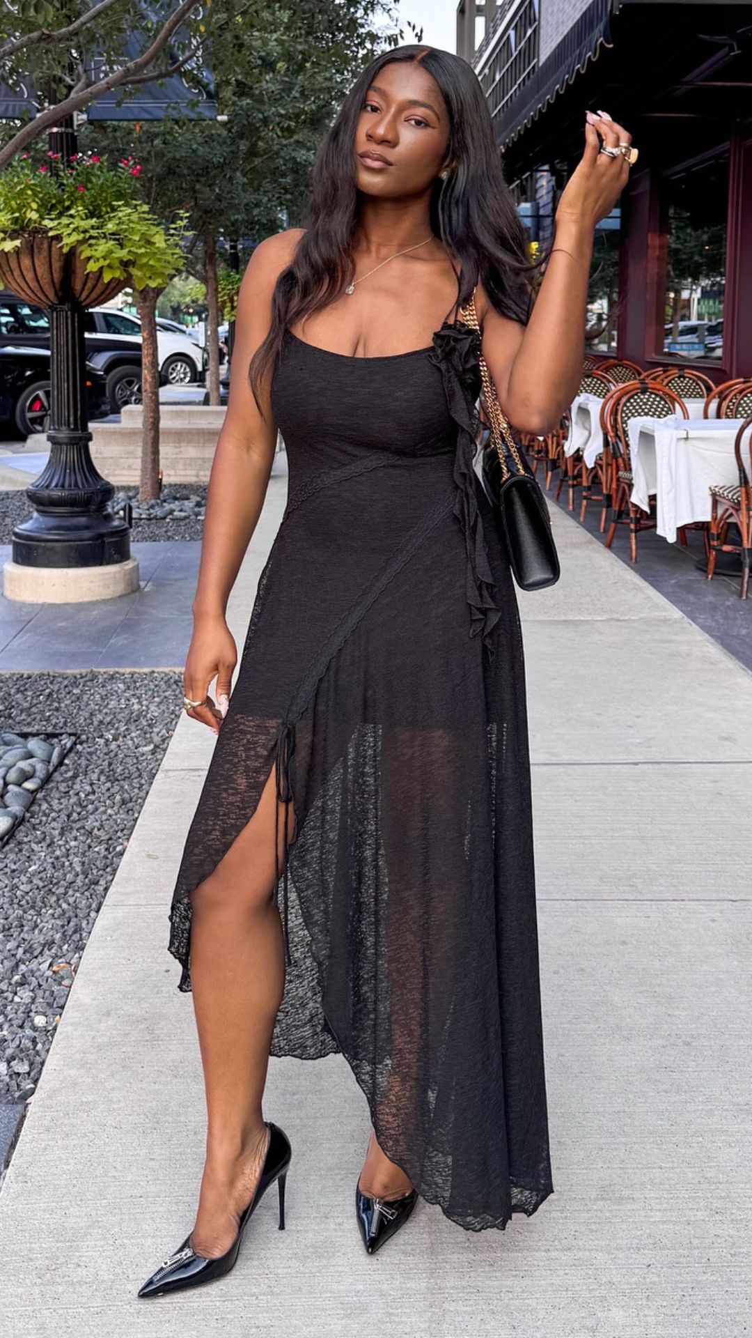 This stunning all-black outfit serves as a statement piece for various occasions, including dinner parties and romantic evenings.