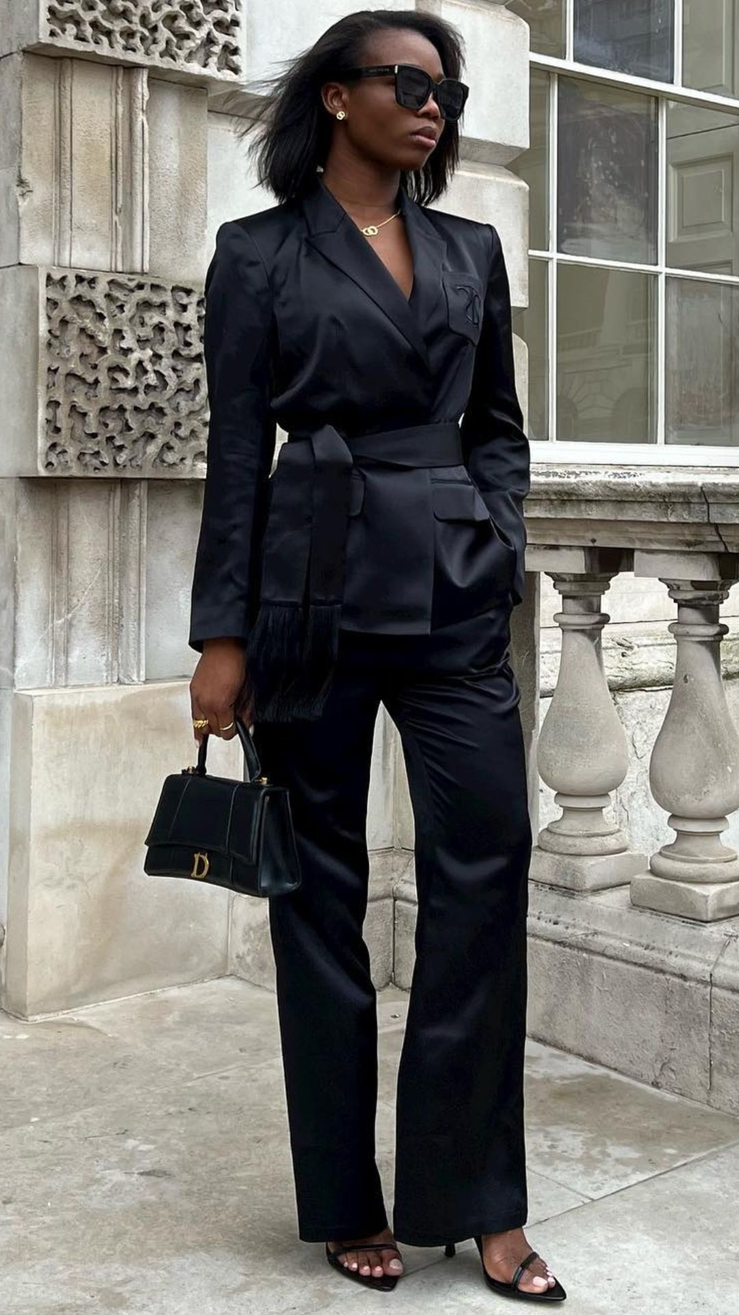 This sophisticated all-black outfit features a sleek, tailored black blazer crafted from smooth satin fabric. The blazer cinches at the waist with a matching belt, creating a flattering silhouette.
