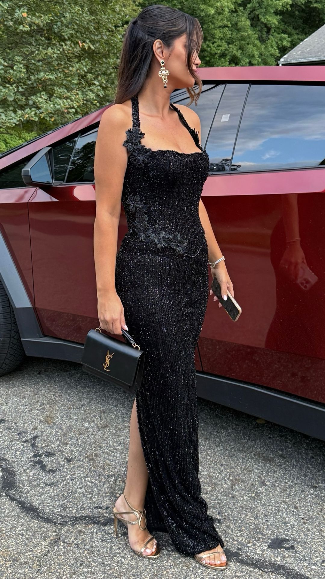 All Black Outfit With a Shimmering Beaded Floor-Length Gown