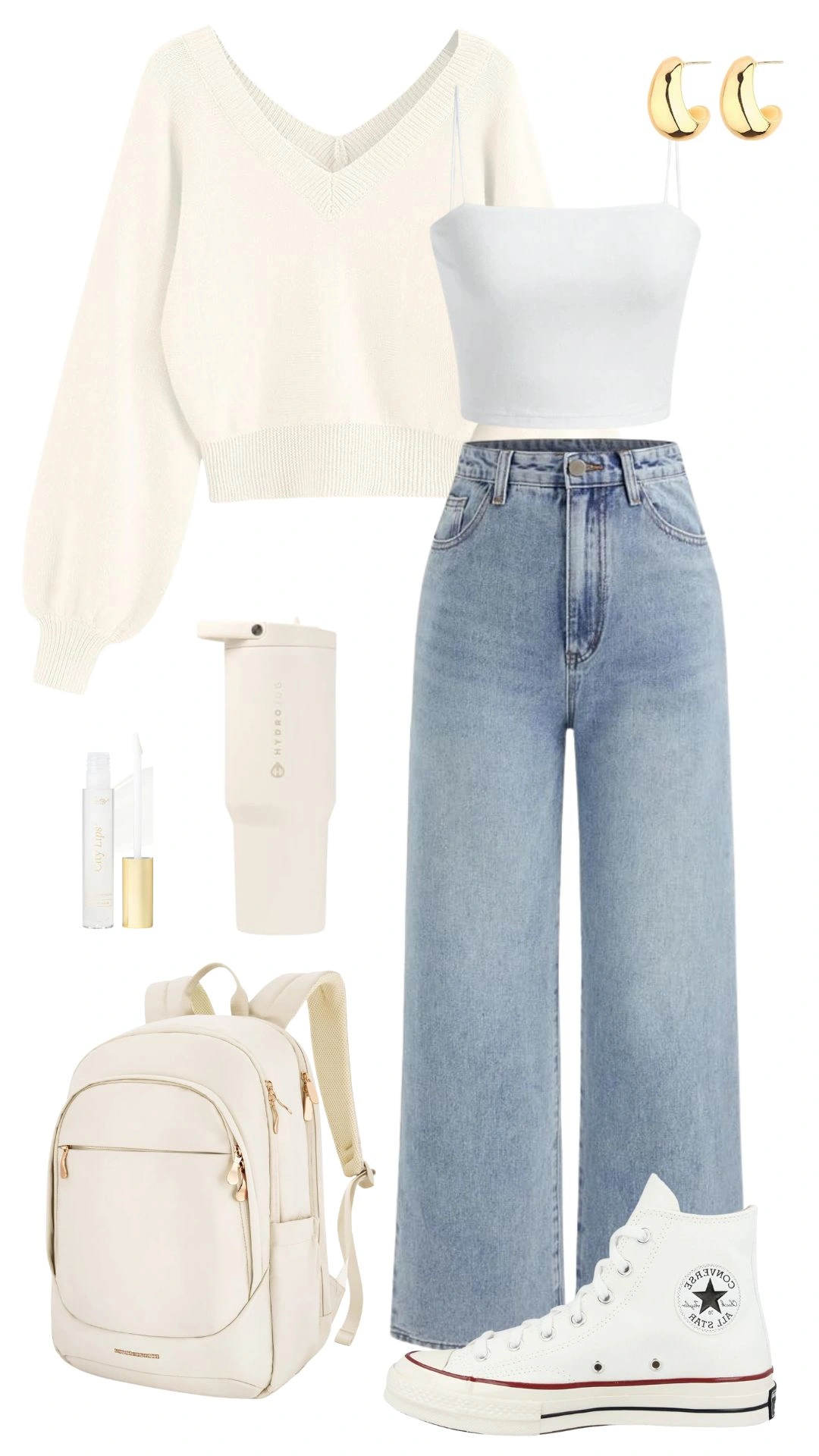 This versatile back-to-school outfit combines comfort and style through carefully curated neutral pieces that create a sophisticated yet casual look.