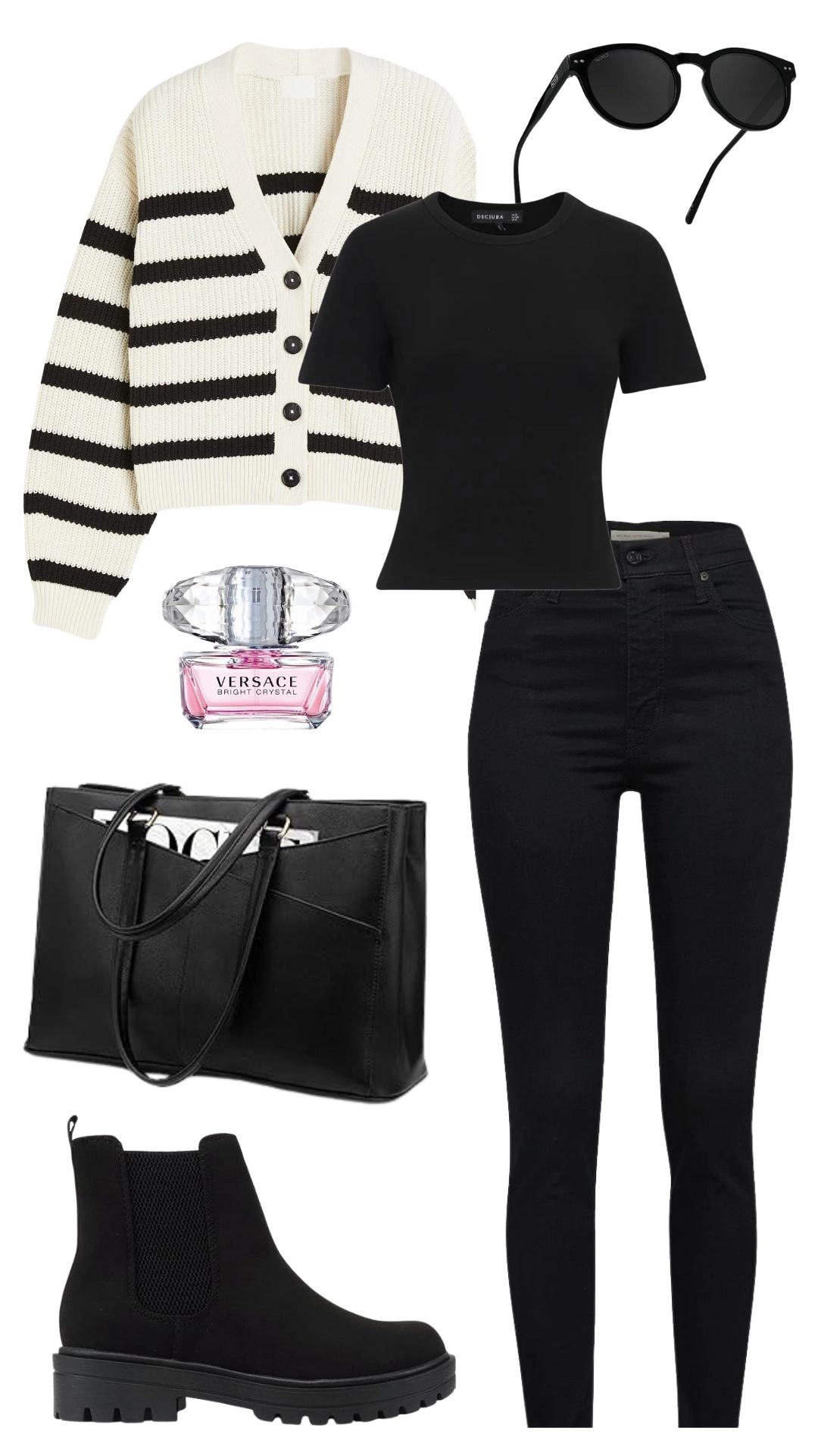 The cream and black striped cardigan adds textural interest and layering potential, while the fitted black t-shirt creates a sleek base layer.