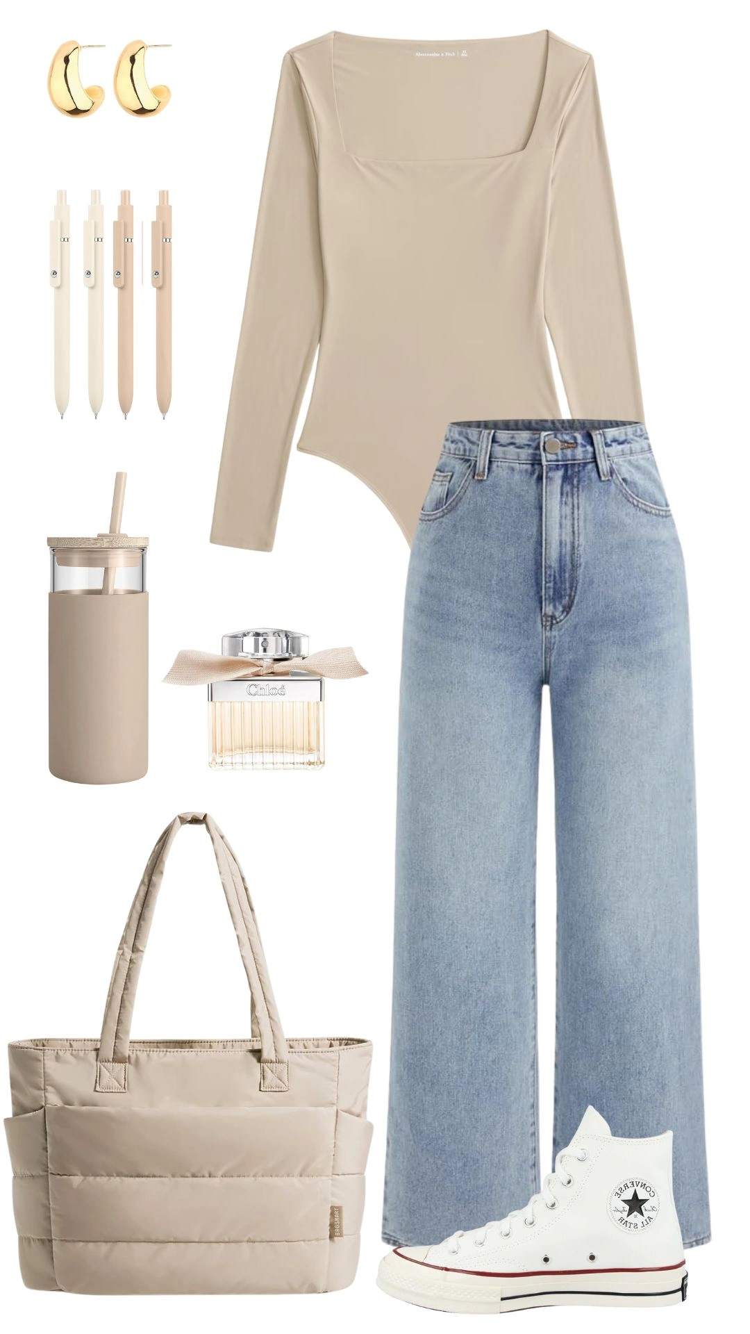 Effortless Neutral Chic: Beige Bodysuit and Wide-Leg Jeans School Day Look