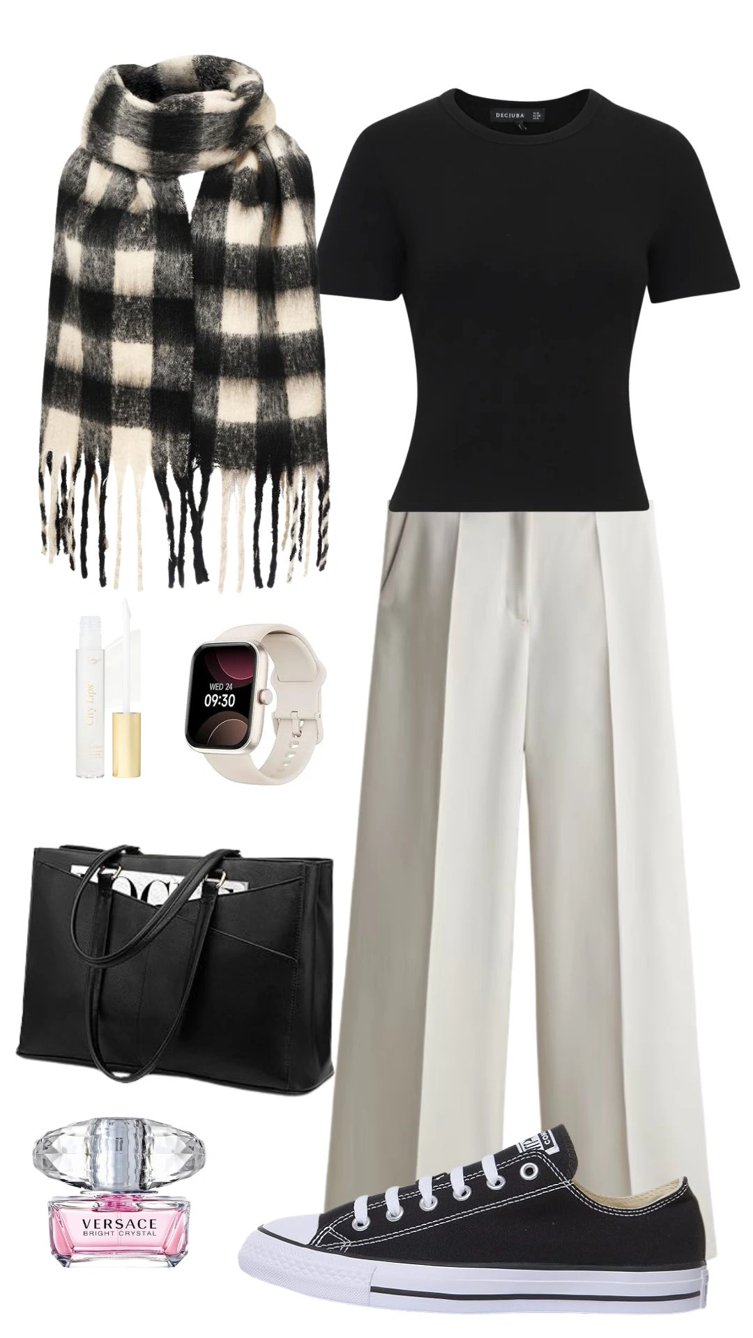 Black Converse sneakers add a casual, youthful element to the outfit, while the black and cream checkered scarf provides a touch of texture and visual interest.