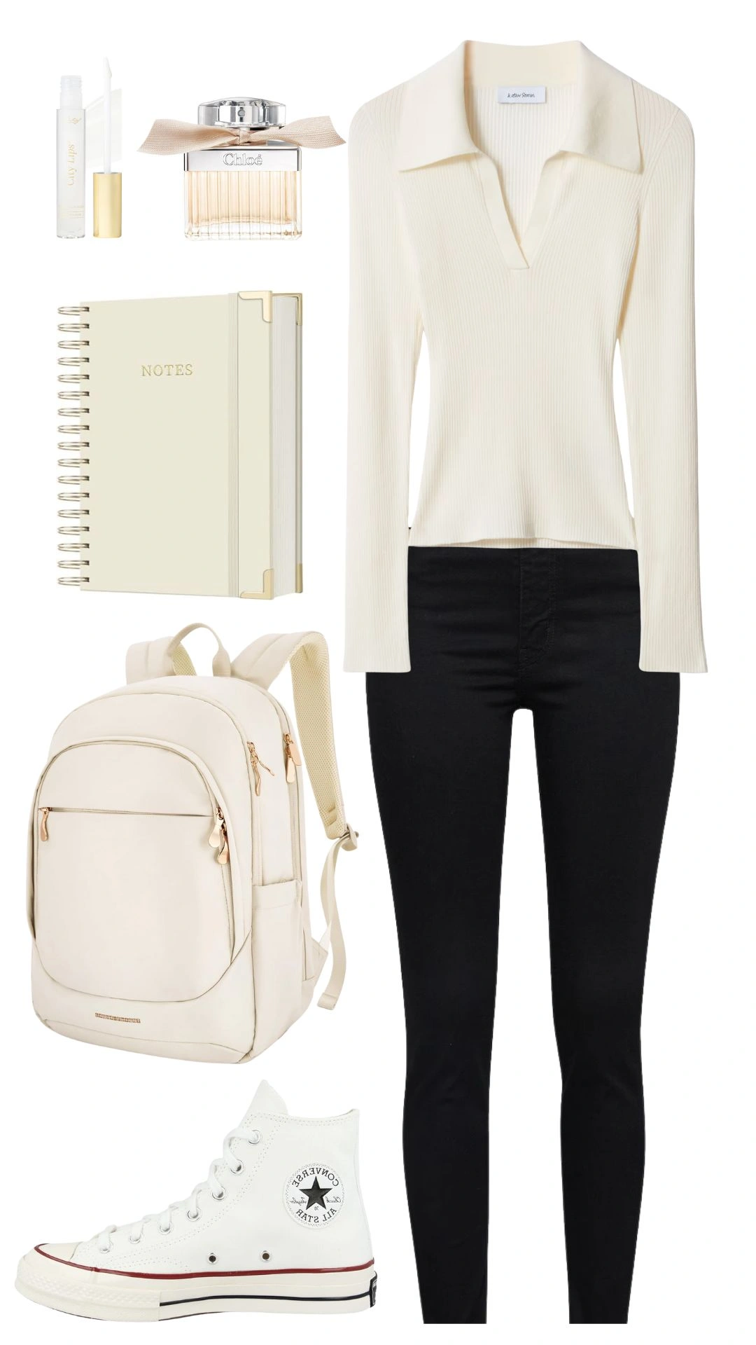 This back-to-school outfit embodies a sophisticated minimalist aesthetic perfect for students looking for a versatile and trendy look.
