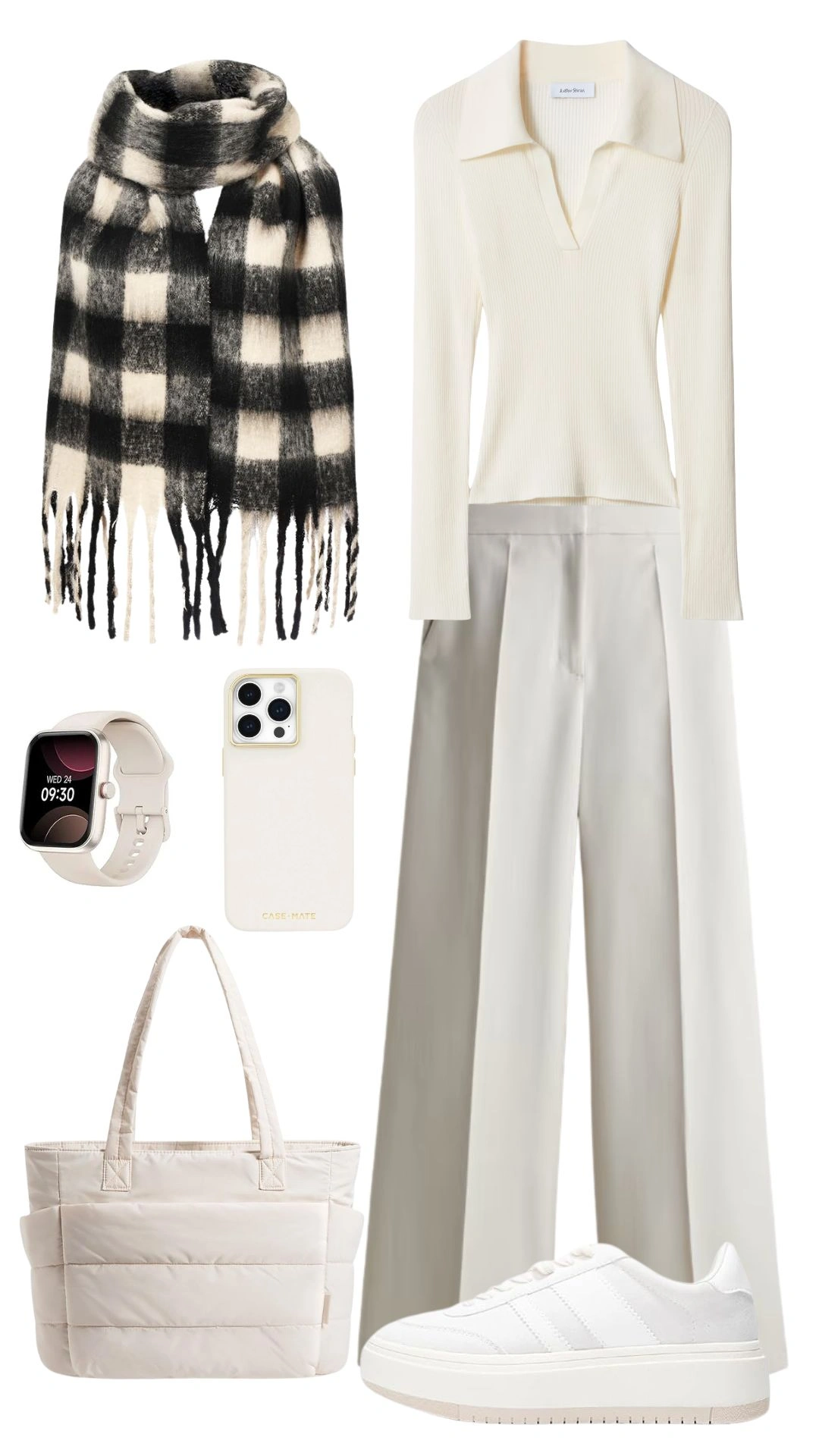 The color palette of beige and white makes it easy to mix-and-match, making this outfit a smart investment for students building a versatile capsule wardrobe.
