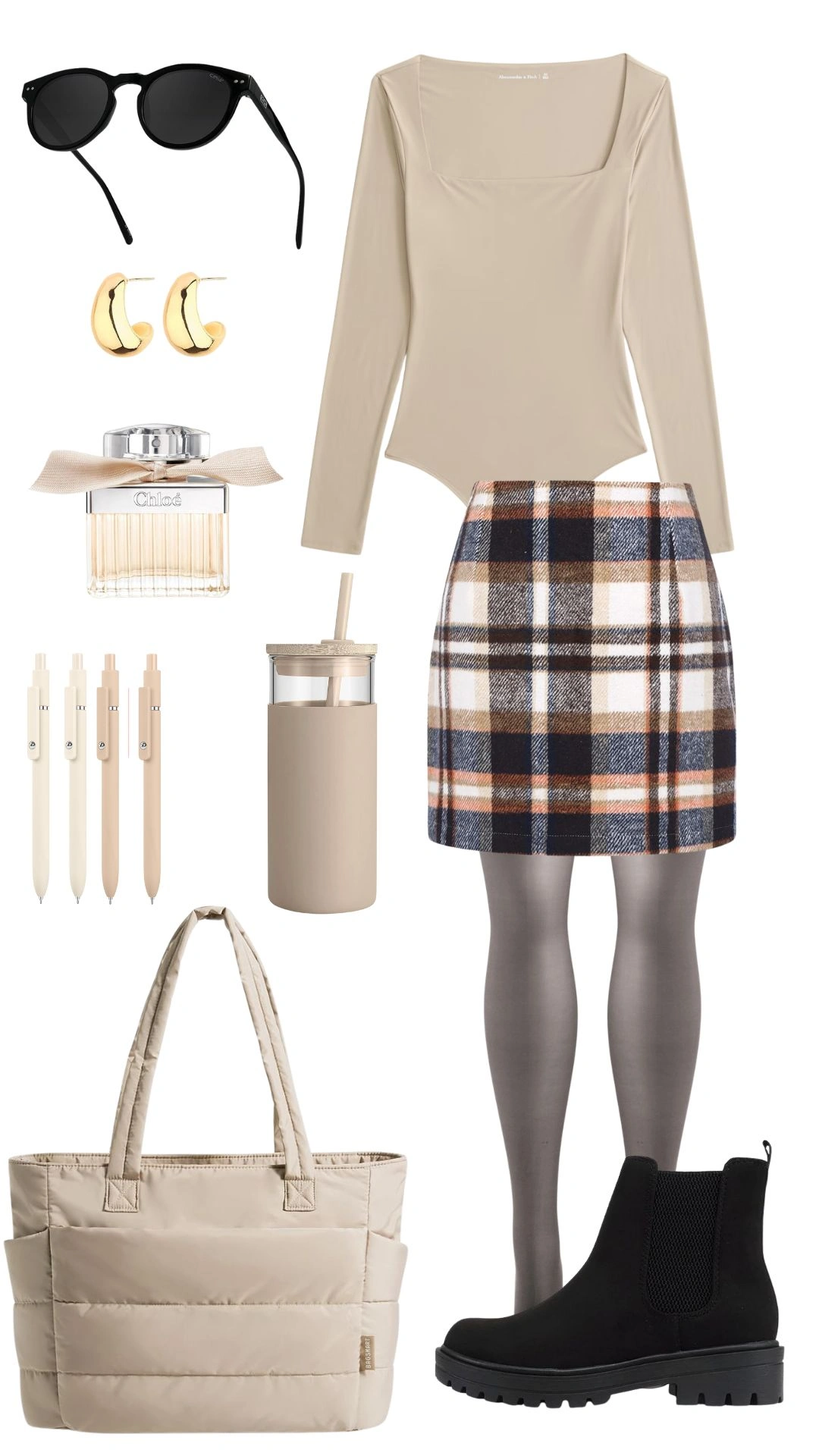 The beige bodysuit provides a clean, streamlined base that allows the navy plaid mini skirt to become the statement piece, while accessories like gold earrings and black chelsea boots add contemporary edge and some polish.