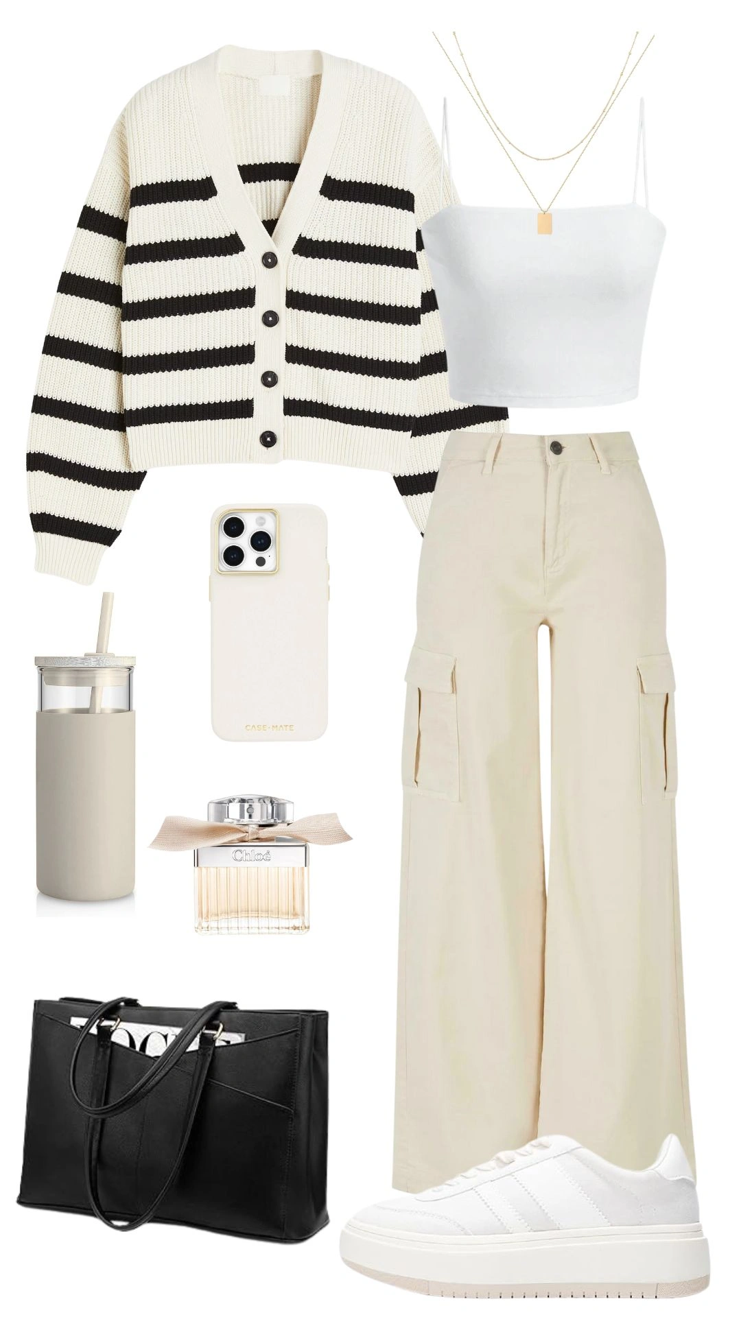 The oversized cardigan provides layering flexibility, while the cropped tank and cargo pants create a modern, laid-back aesthetic that feels contemporary and age-appropriate.