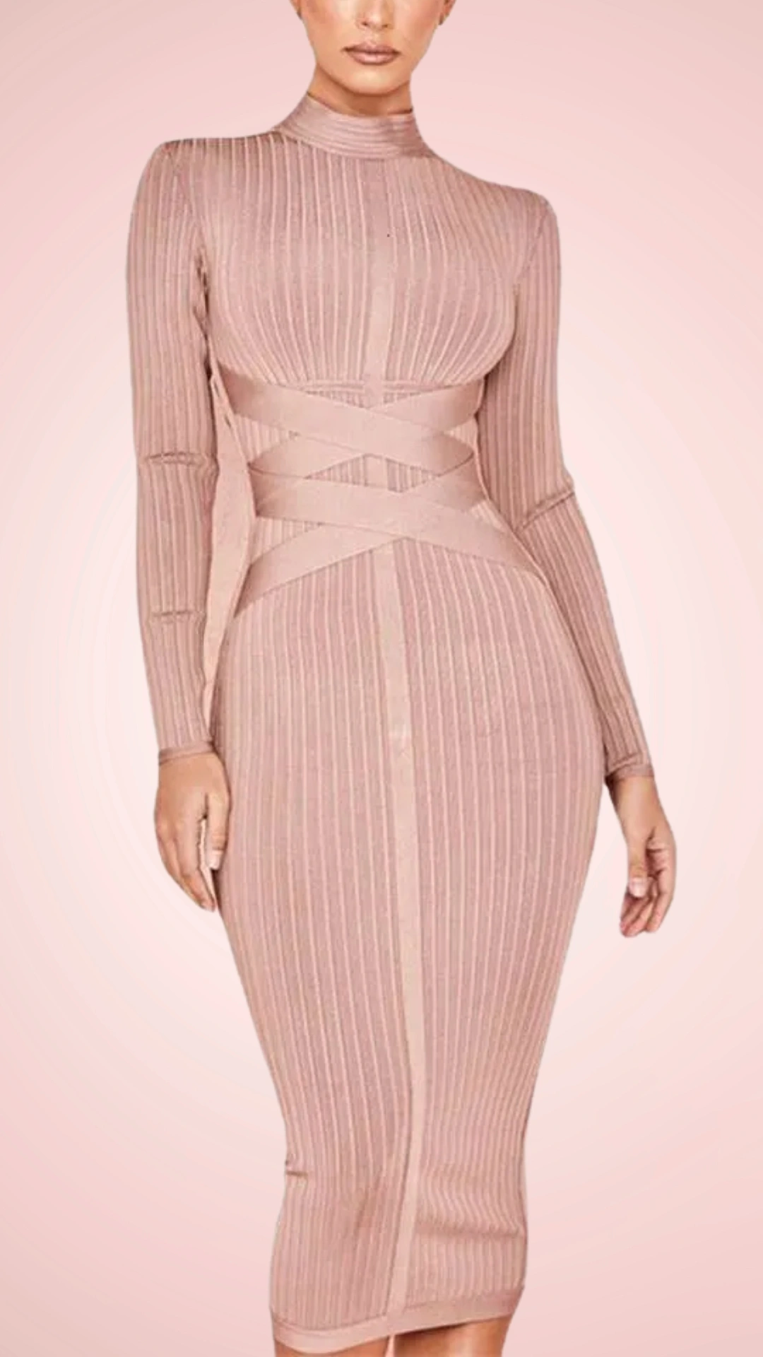 This stunning blush pink bandage dress seamlessly combines comfort and style, making it an alluring choice for any occasion.