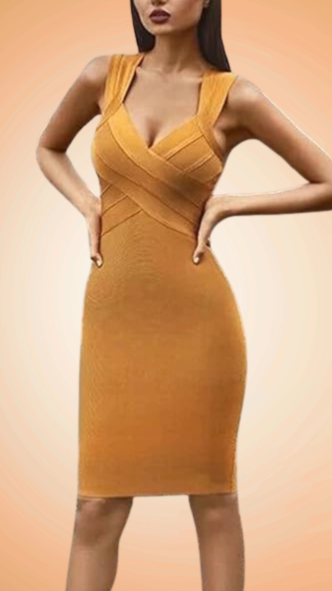 This fitted bandage dress radiates confidence and sophistication with its vibrant mustard yellow hue.