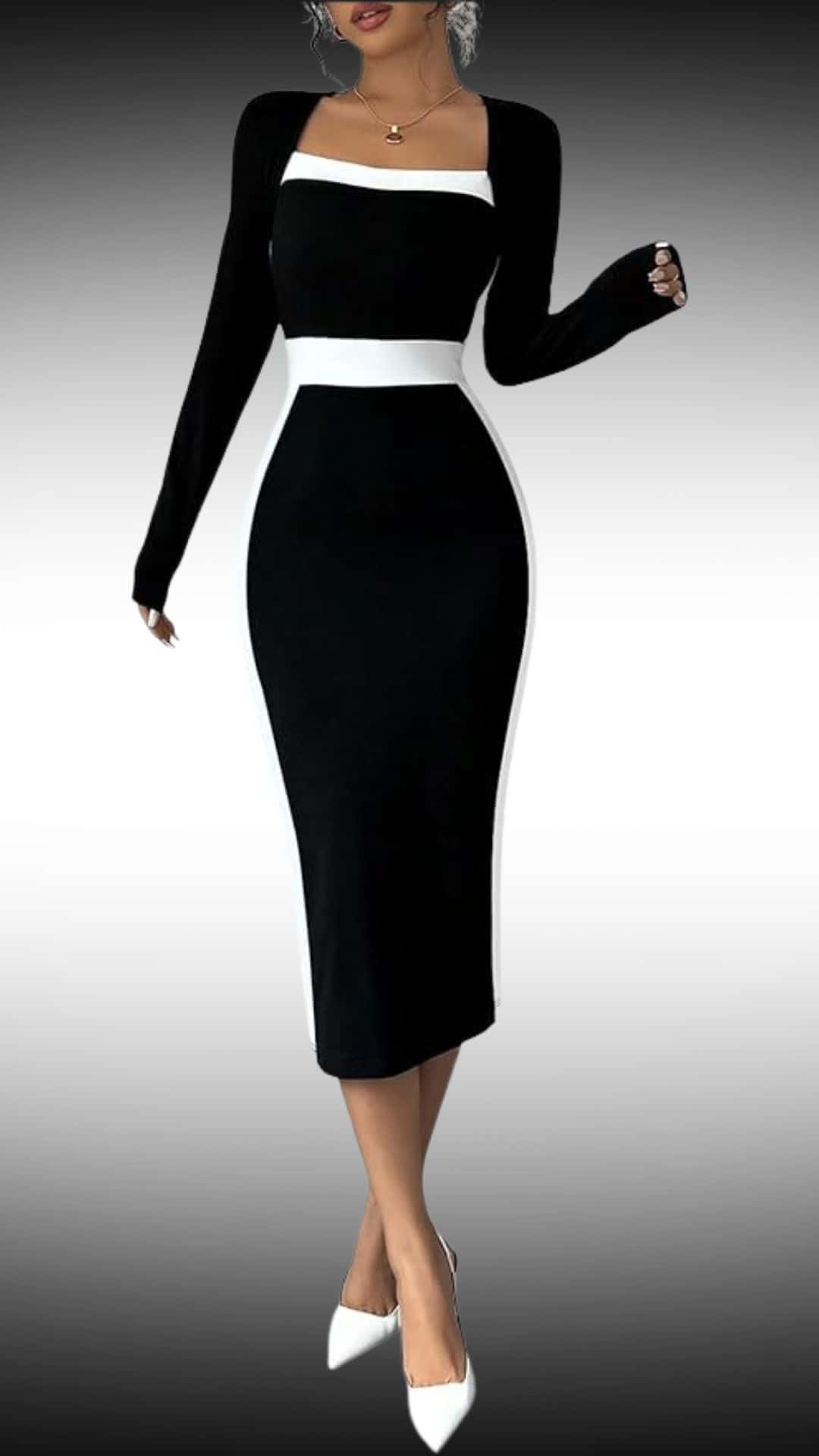 This elegant black and white dress is a standout piece characterized by its fitted silhouette and sophisticated square neckline.
