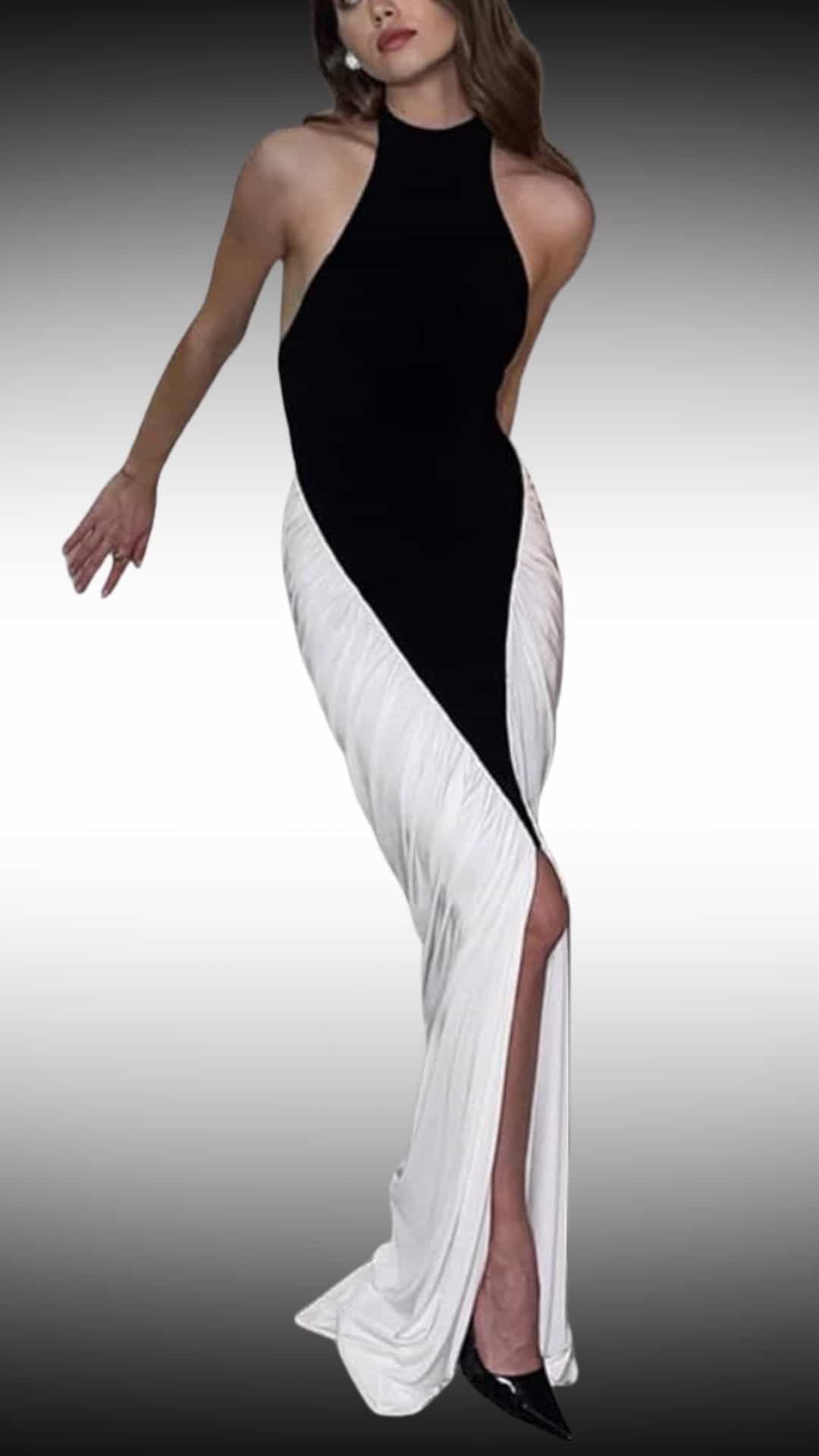 This stunning black and white dress is the epitome of elegance, featuring a sleek halter neckline that beautifully frames the shoulders.