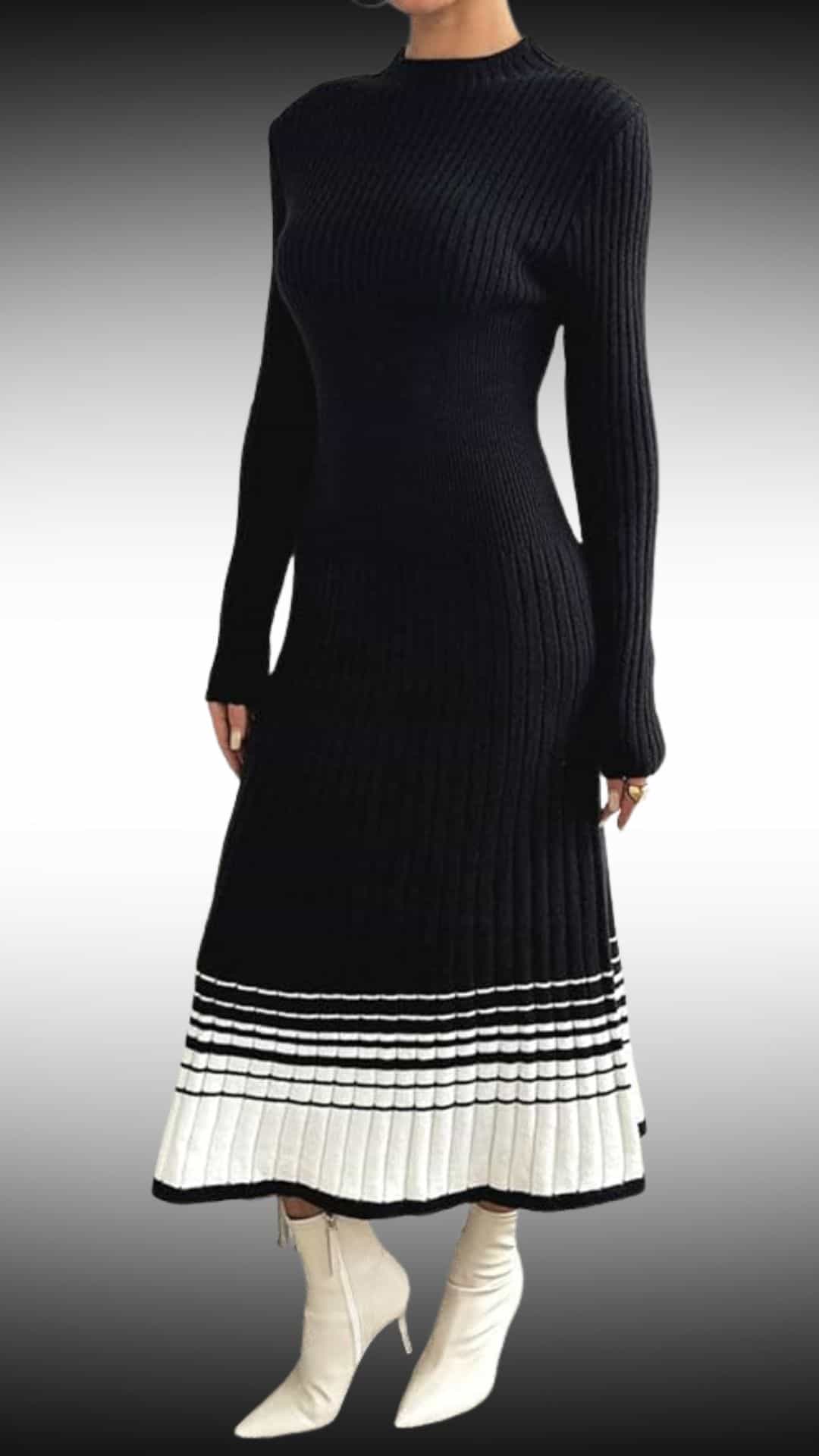 This elegant black and white dress combines a fitted black ribbed bodice with a sophisticated high neckline and long sleeves, making it an ideal choice for formal events or casual outings alike.