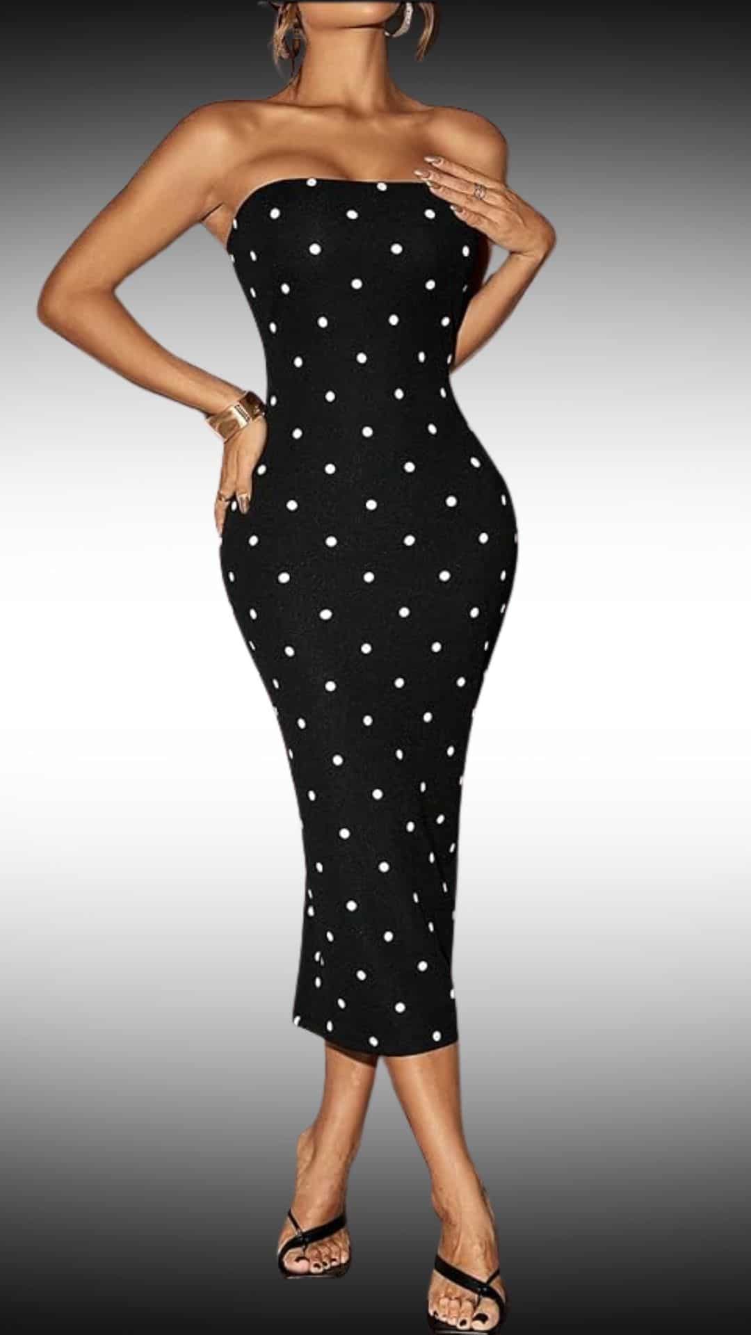 This stunning black dress, embellished with a classic white polka dot pattern, is the epitome of sophisticated style.