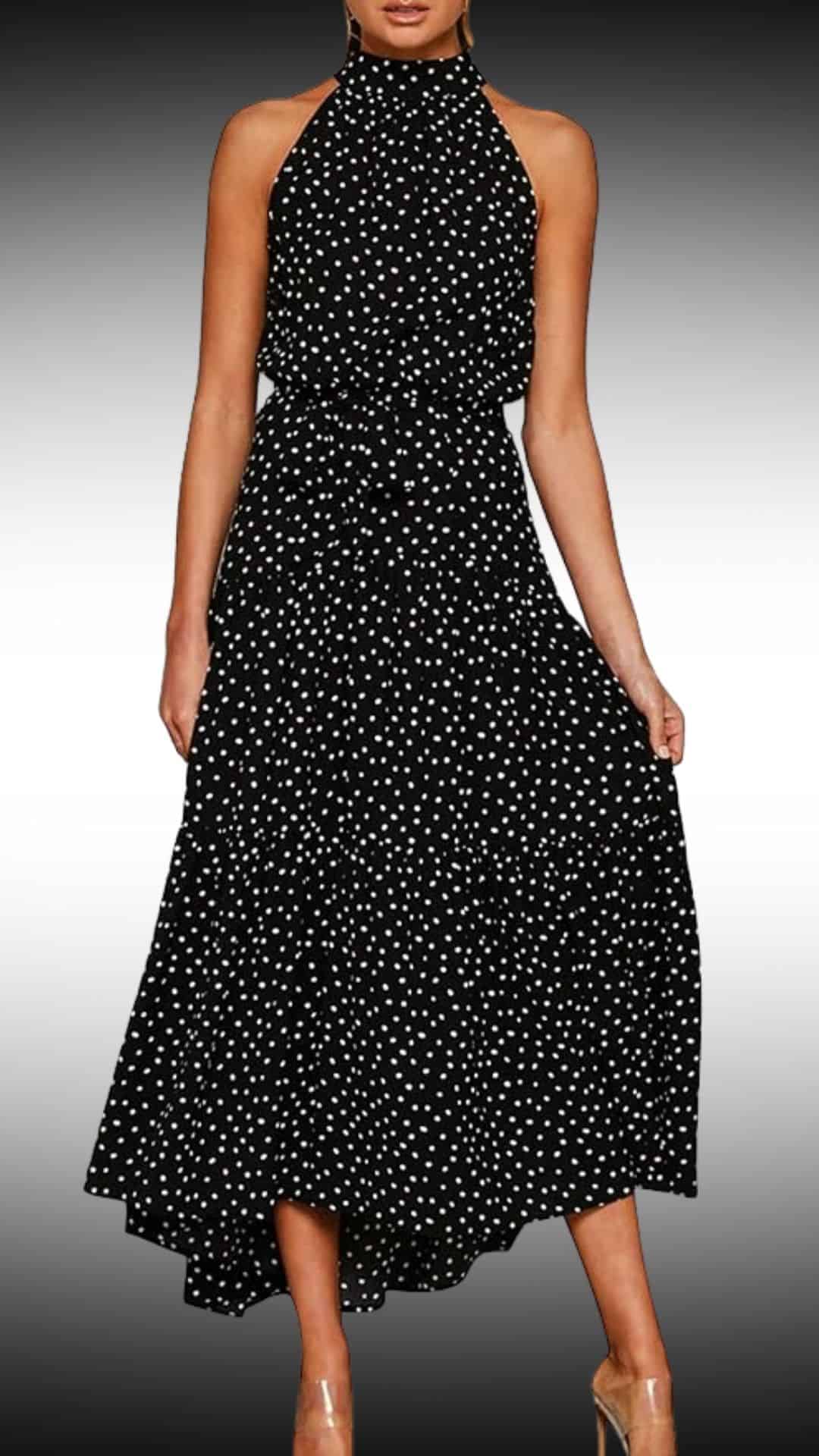 The flowing, ankle-length silhouette is complemented by a delightful polka dot pattern, adding a touch of whimsy to the classic color scheme.