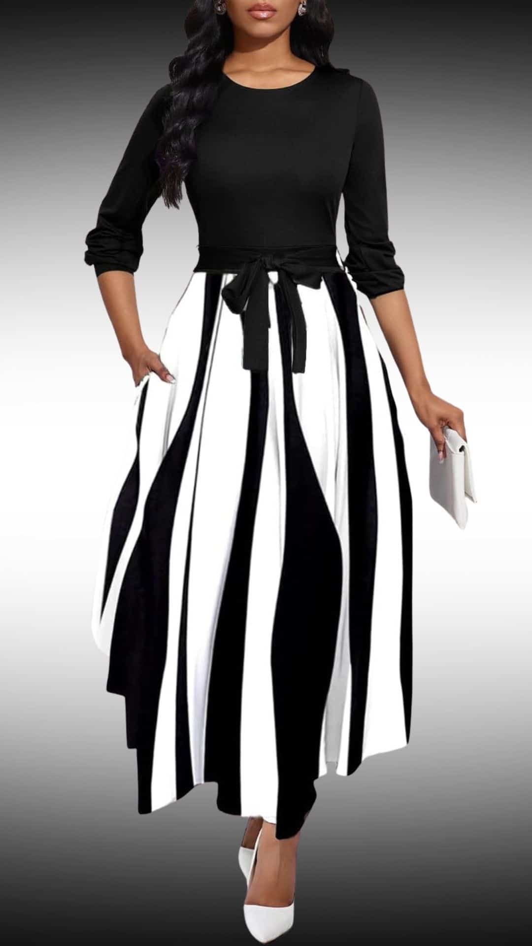 This elegant black and white dress is a must-have for those seeking versatility coupled with sophistication.