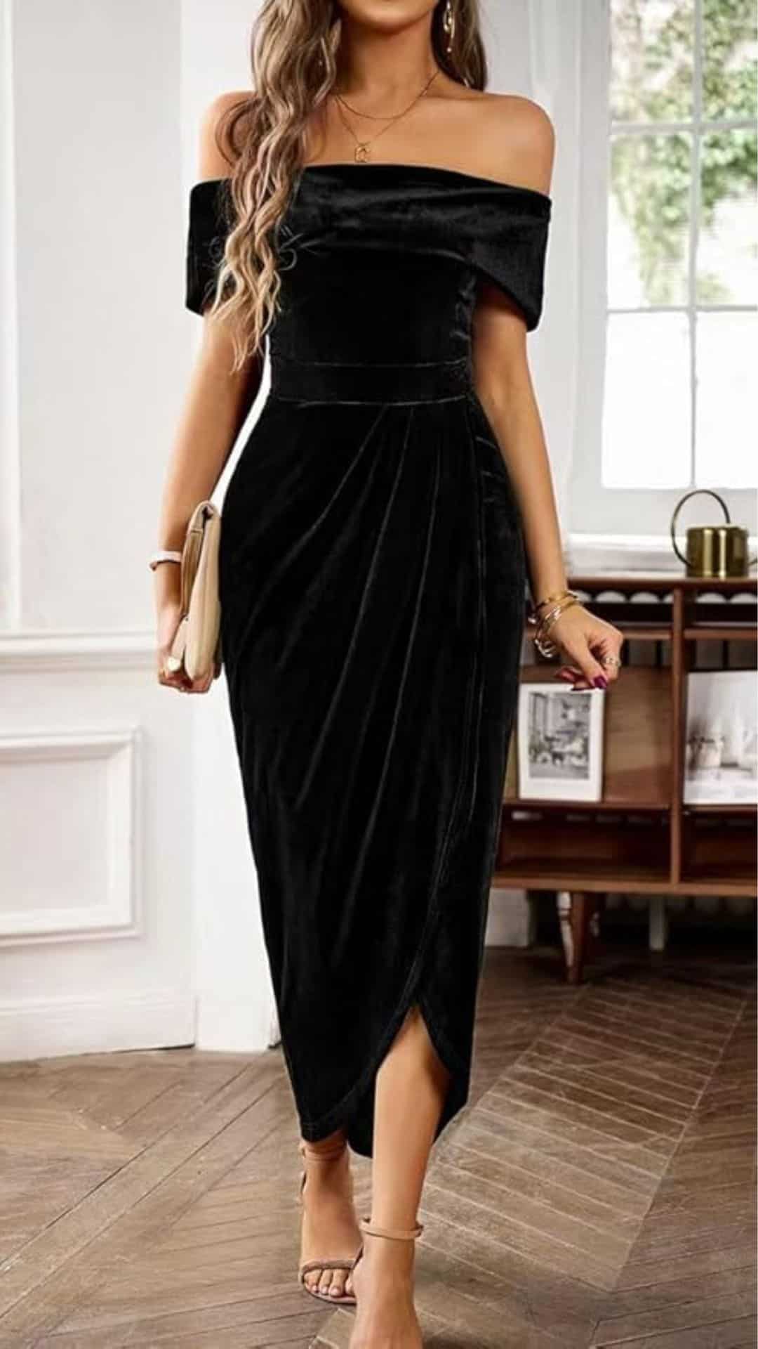 The slim-fit black velvet cocktail dress exemplifies modern sophistication with its striking off-the-shoulder design that accentuates the neckline beautifully.