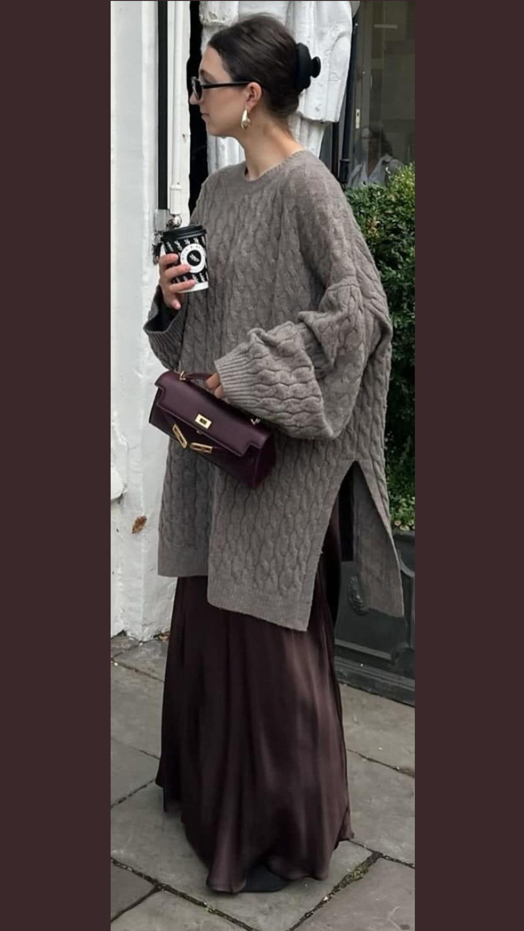 This oversized cable-knit brown sweater creates a relaxed yet chic vibe when paired with a flowing, deep chocolate skirt.