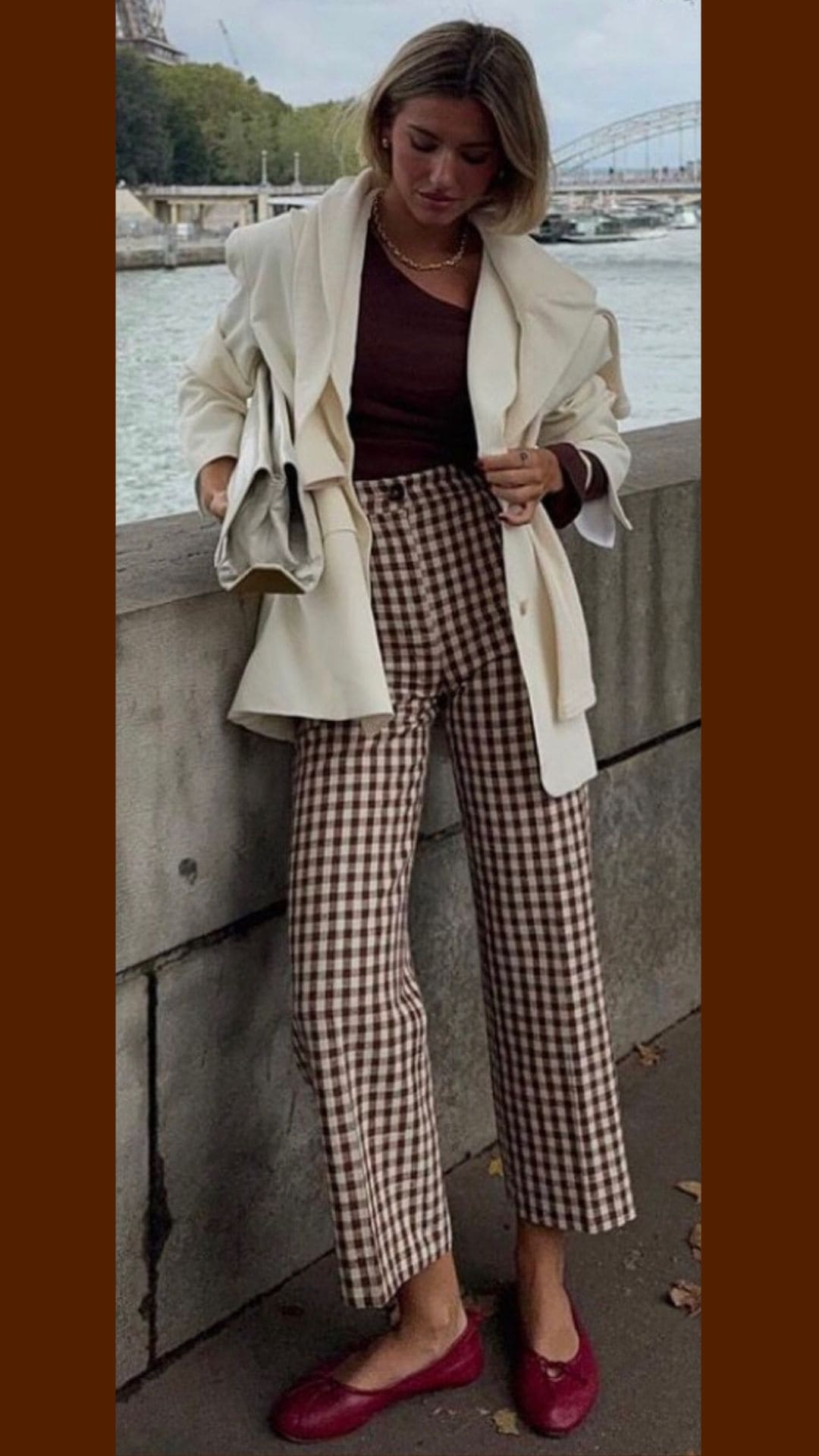 The fitted chocolate-brown top seamlessly complements the high-waisted beige and brown gingham plaid trousers, creating a harmonious balance of colors and patterns.