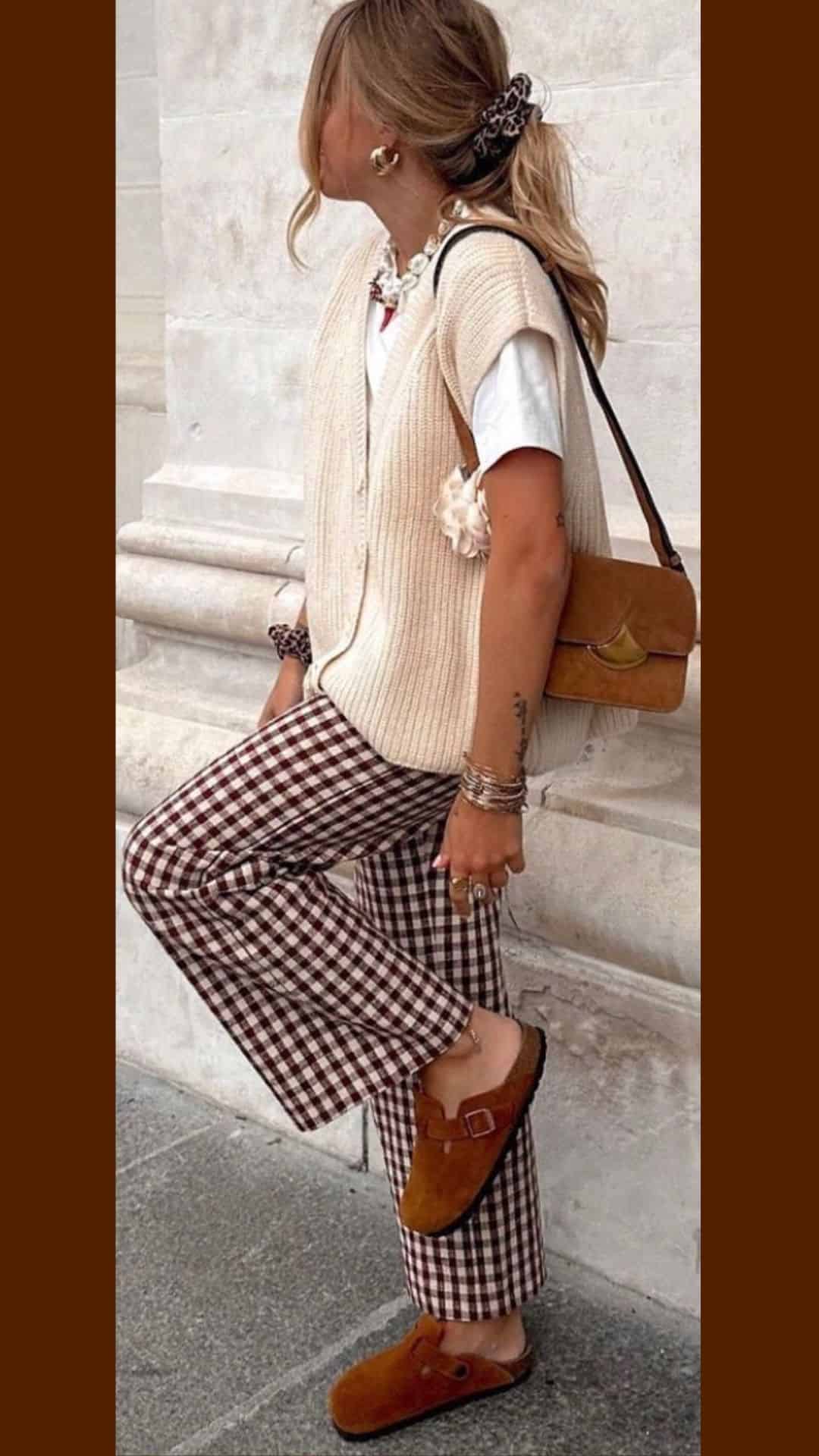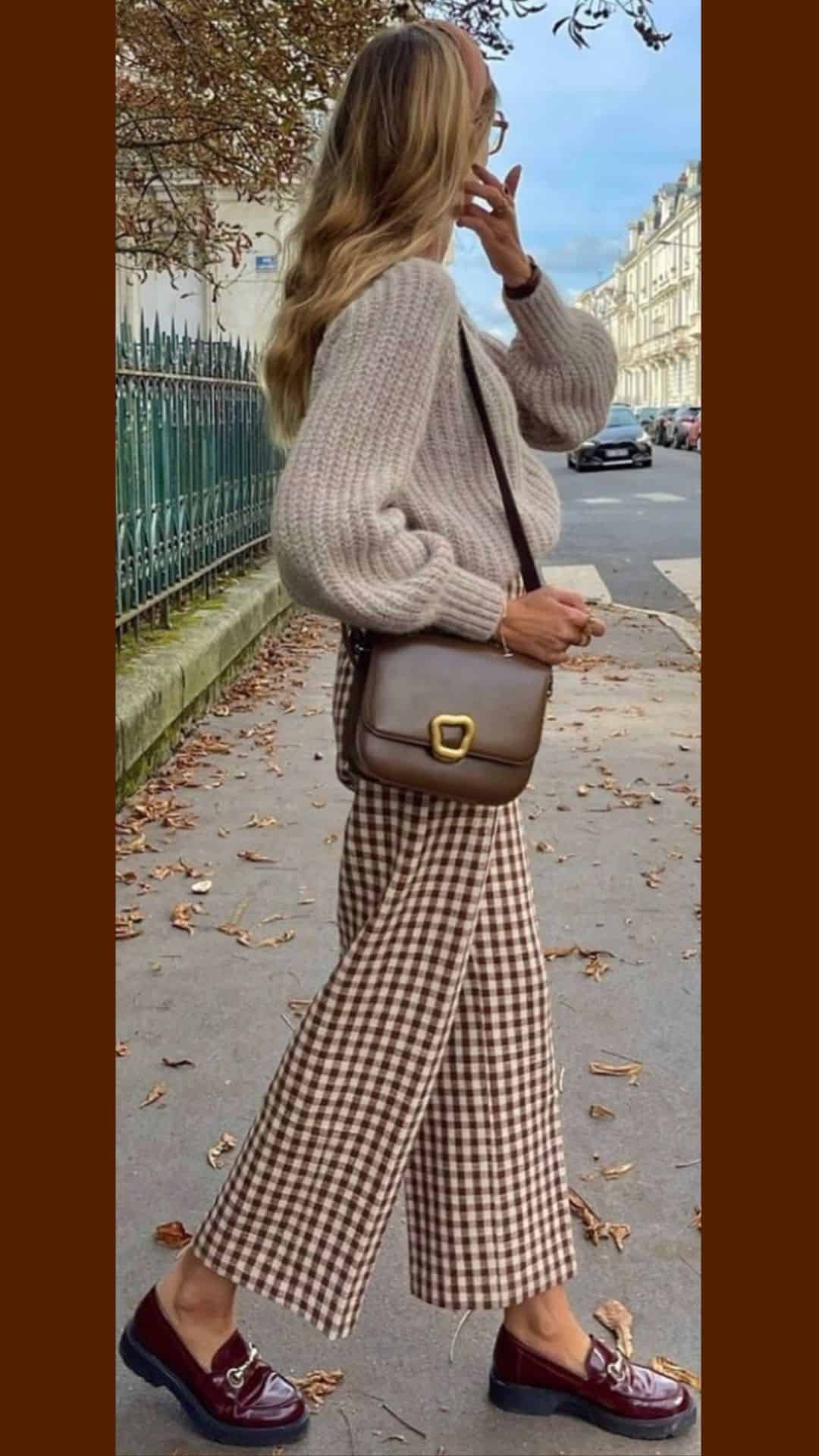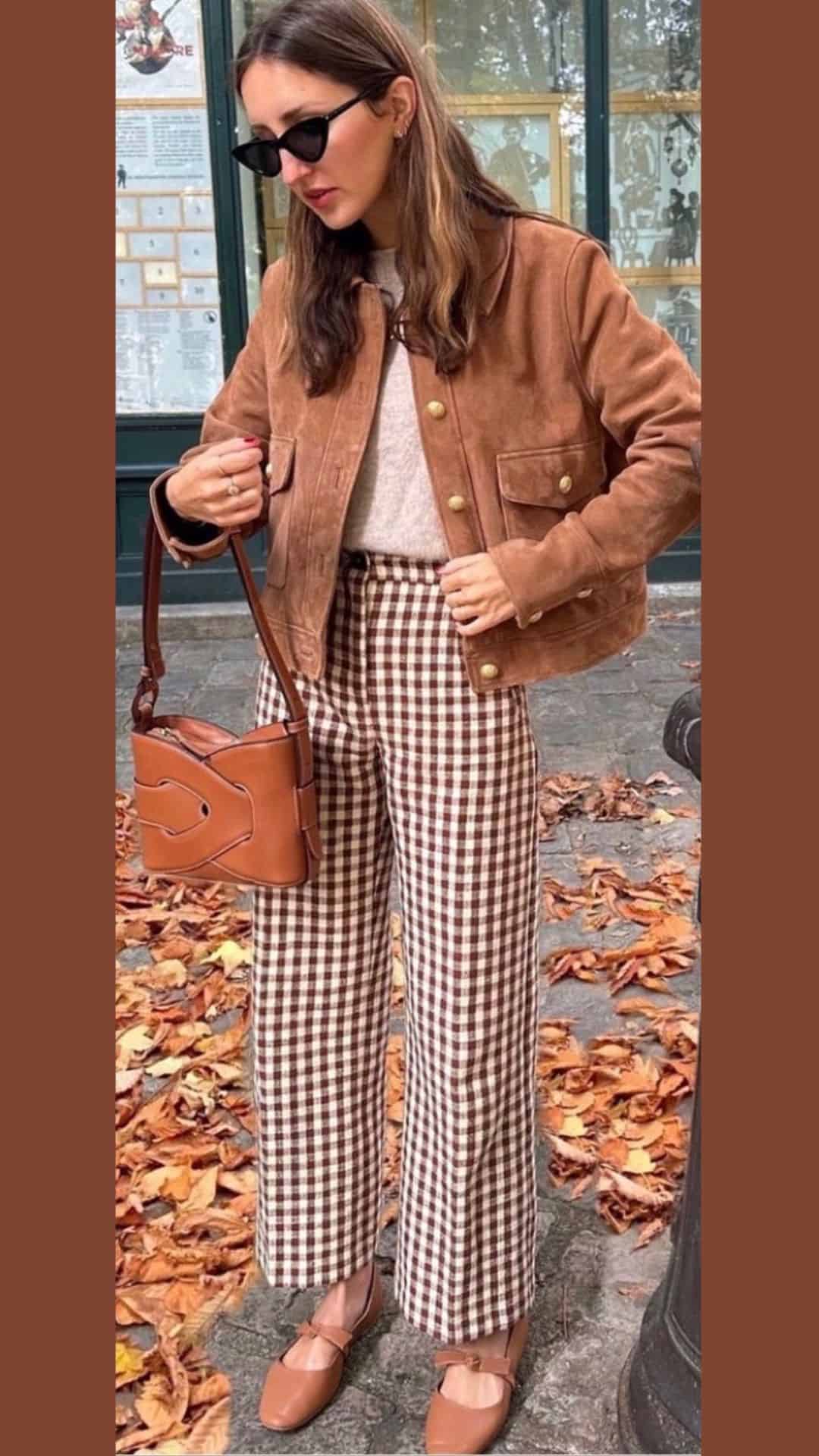 The brown and cream plaid wide-leg trousers add a touch of sophistication, creating a balanced look that highlights the versatility of brown hues.