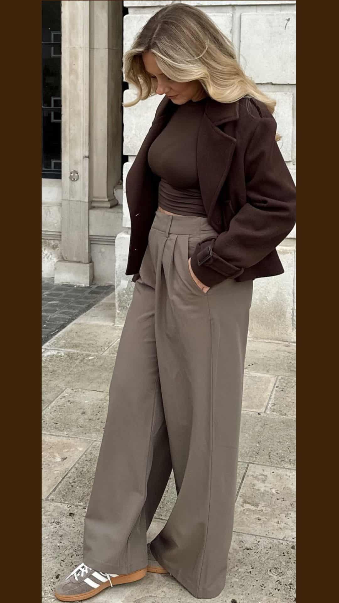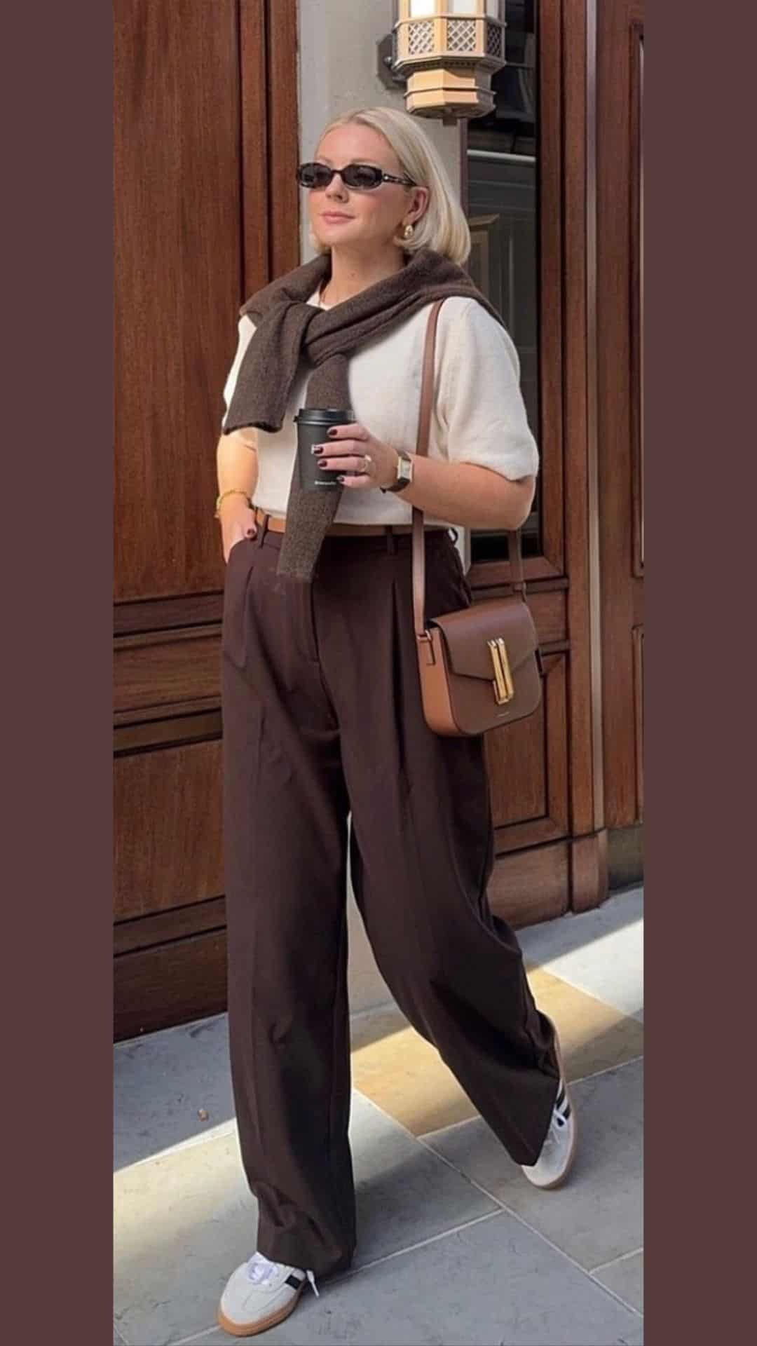 Paired with dark brown wide-leg trousers, the outfit creates a harmonious balance of style and ease.
