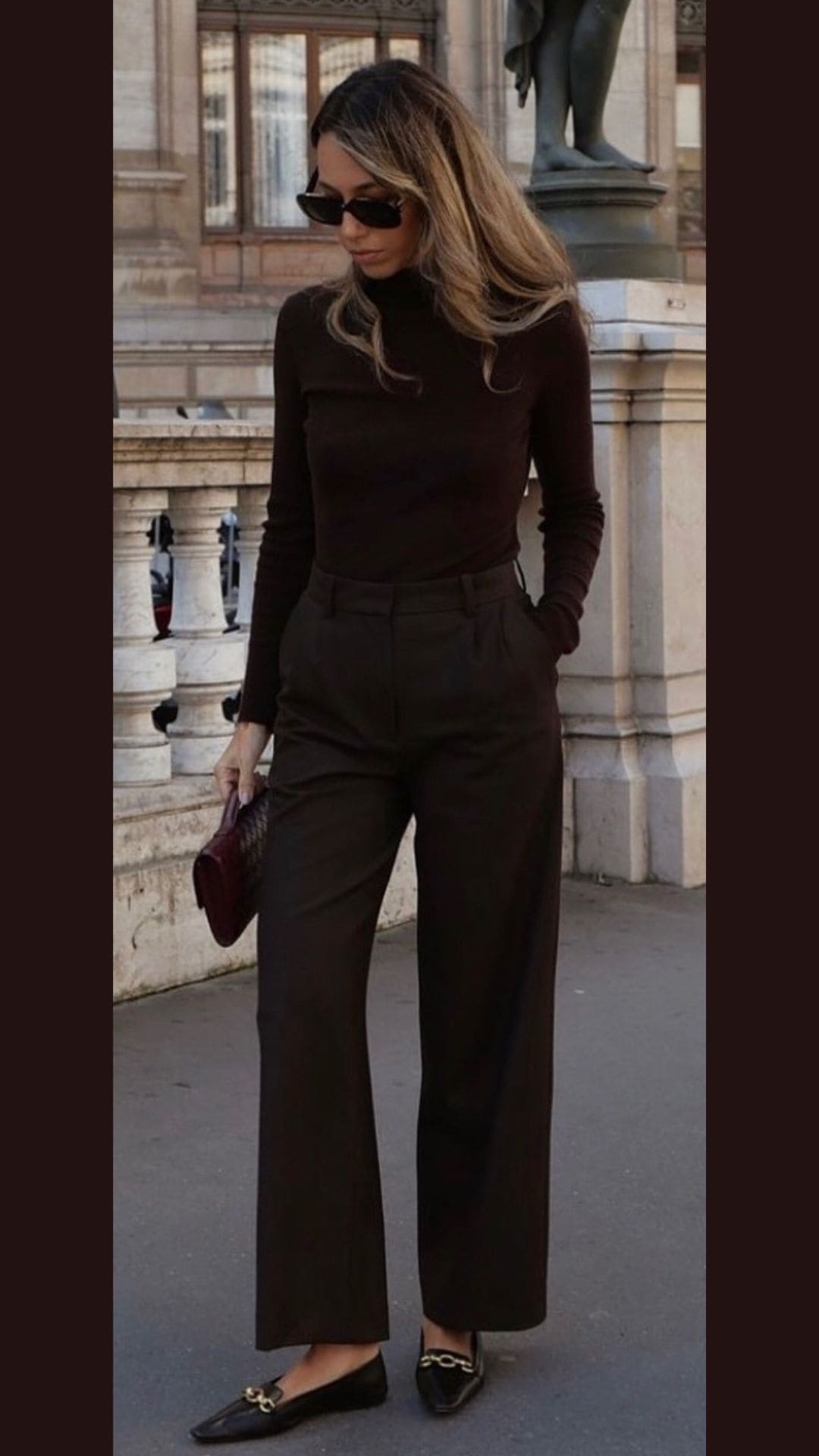 This brown outfit features a fitted turtleneck that perfectly hugs the body, paired with high-waisted, wide-leg trousers that elongate the legs.