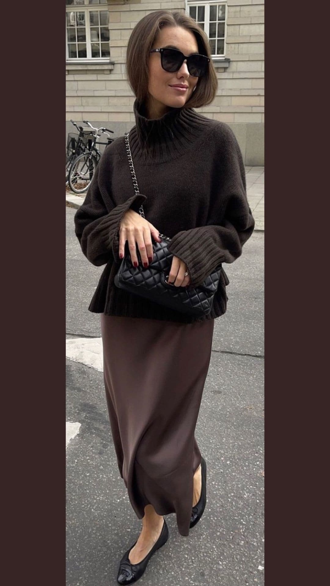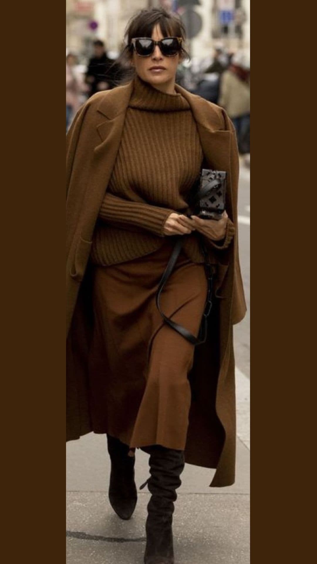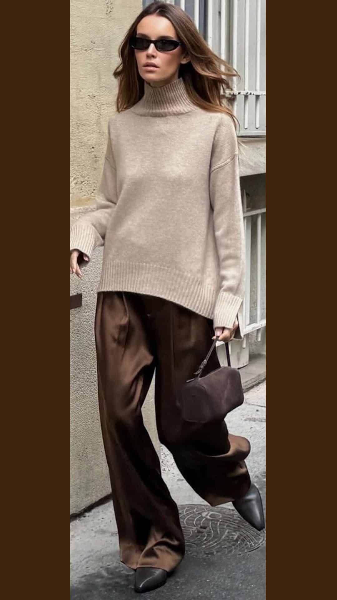 This brown outfit effortlessly blends comfort and elegance, featuring a plush, oversized dark brown turtleneck sweater that adds a cozy touch.