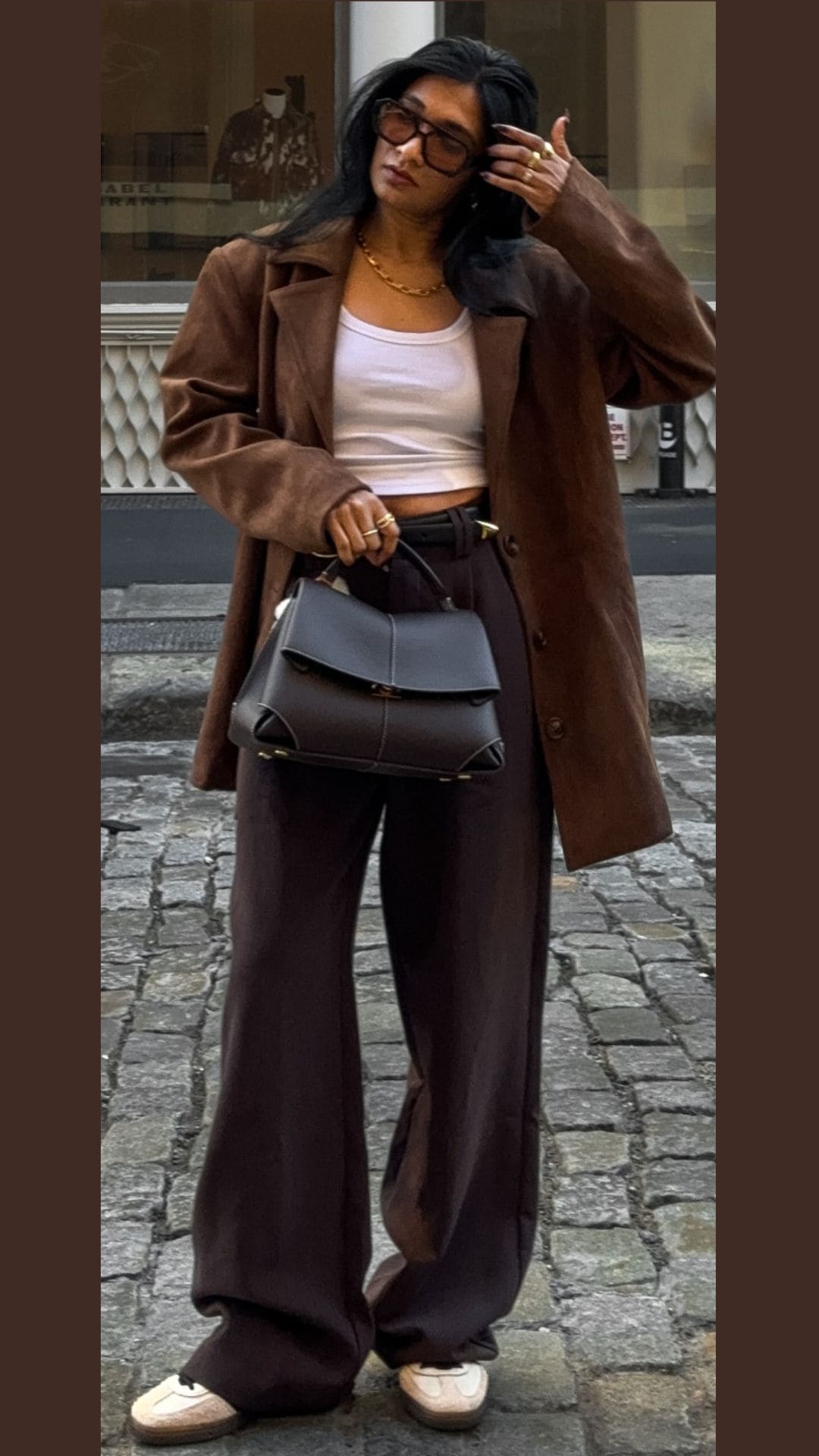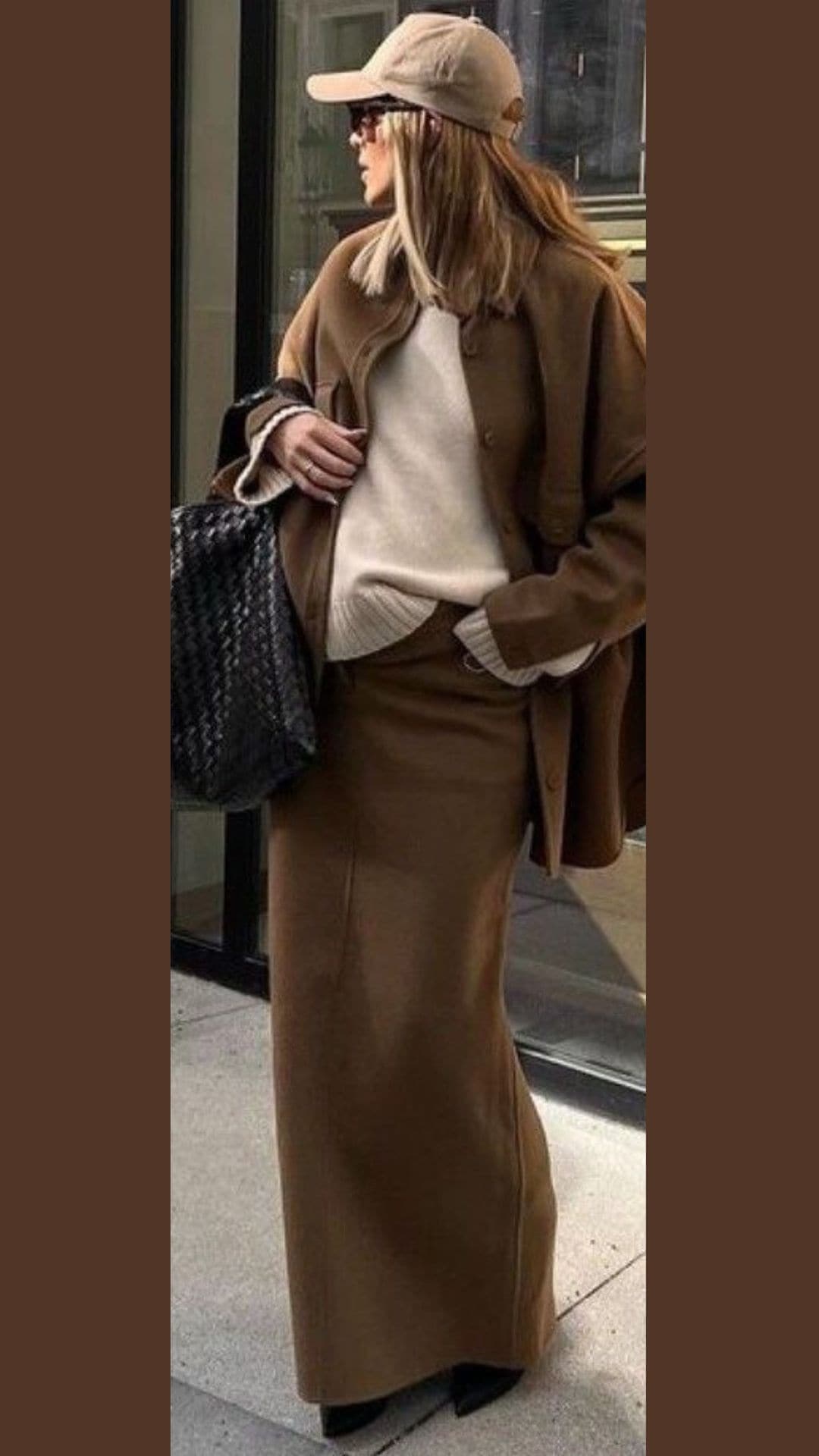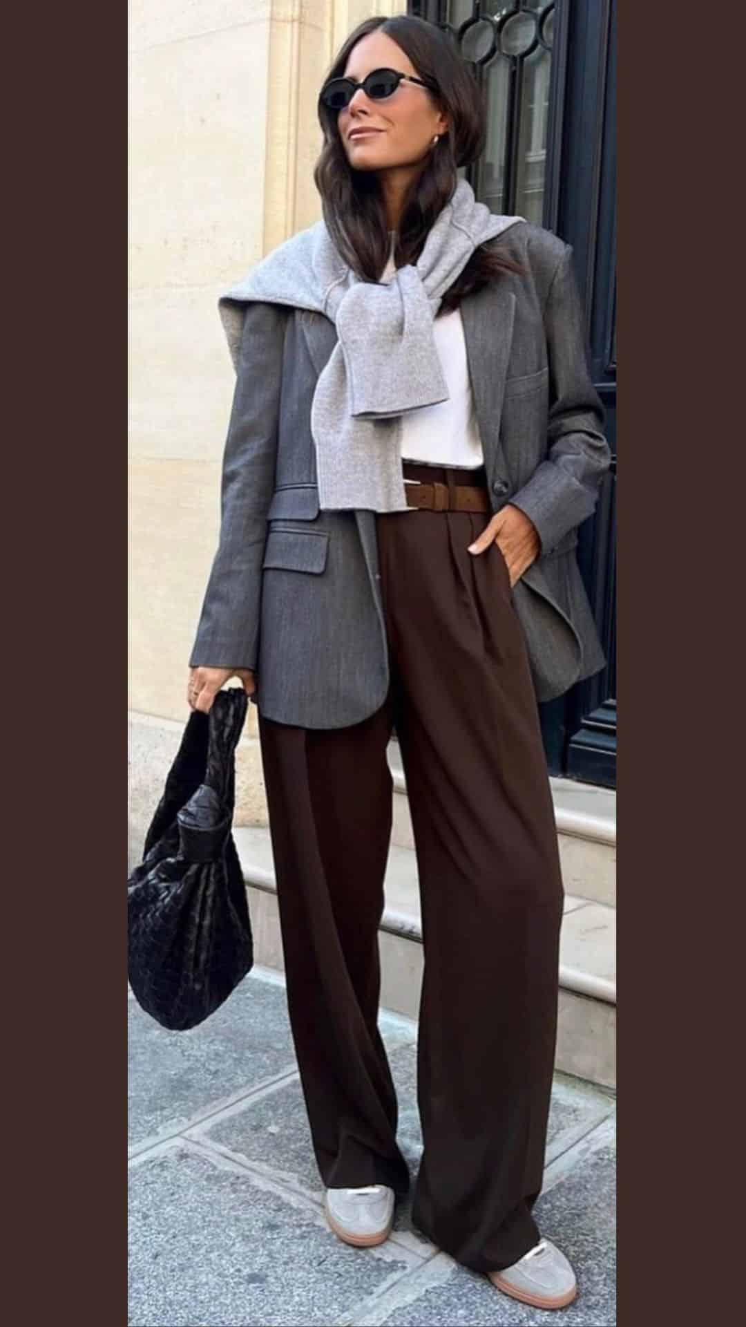 Paired with a slouchy brown bag and sleek black shoes, this ensemble balances chic style with comfort, highlighting the versatility of brown in fashion.