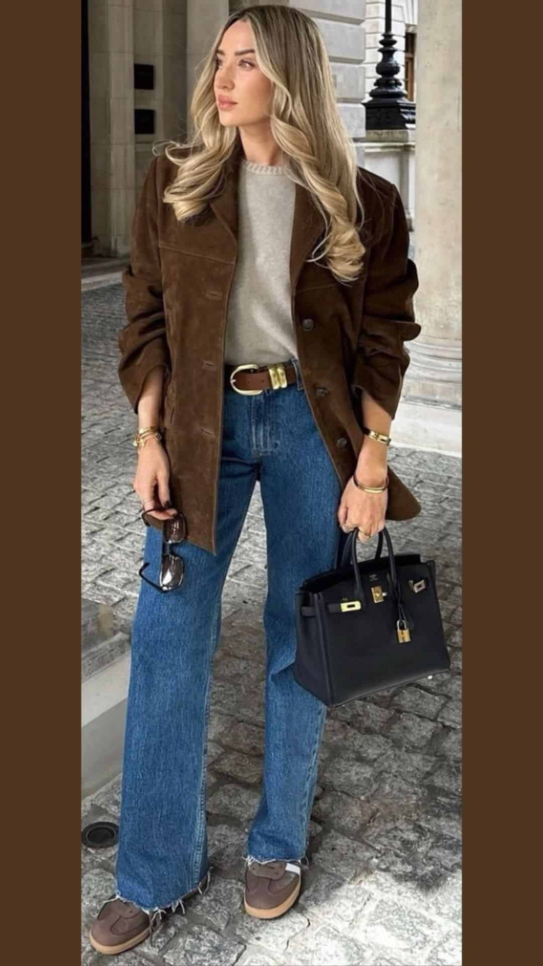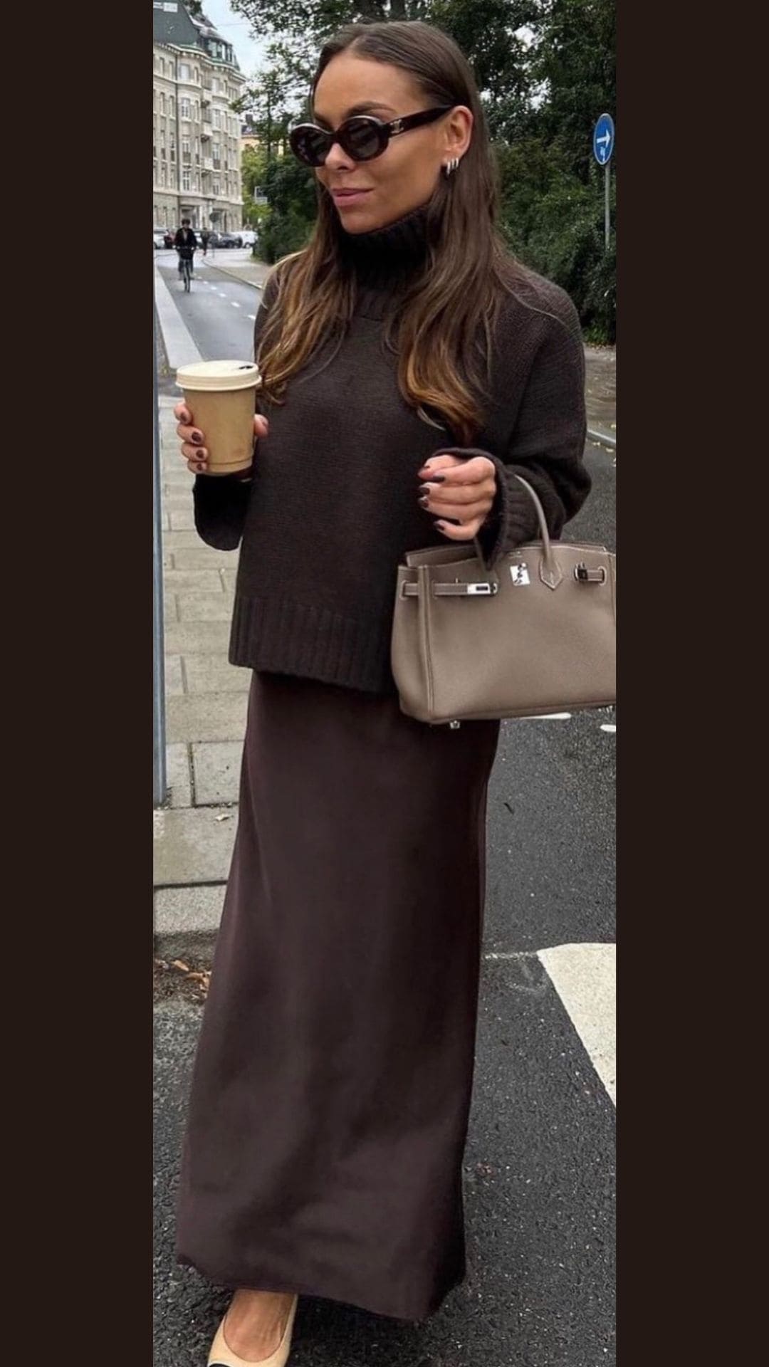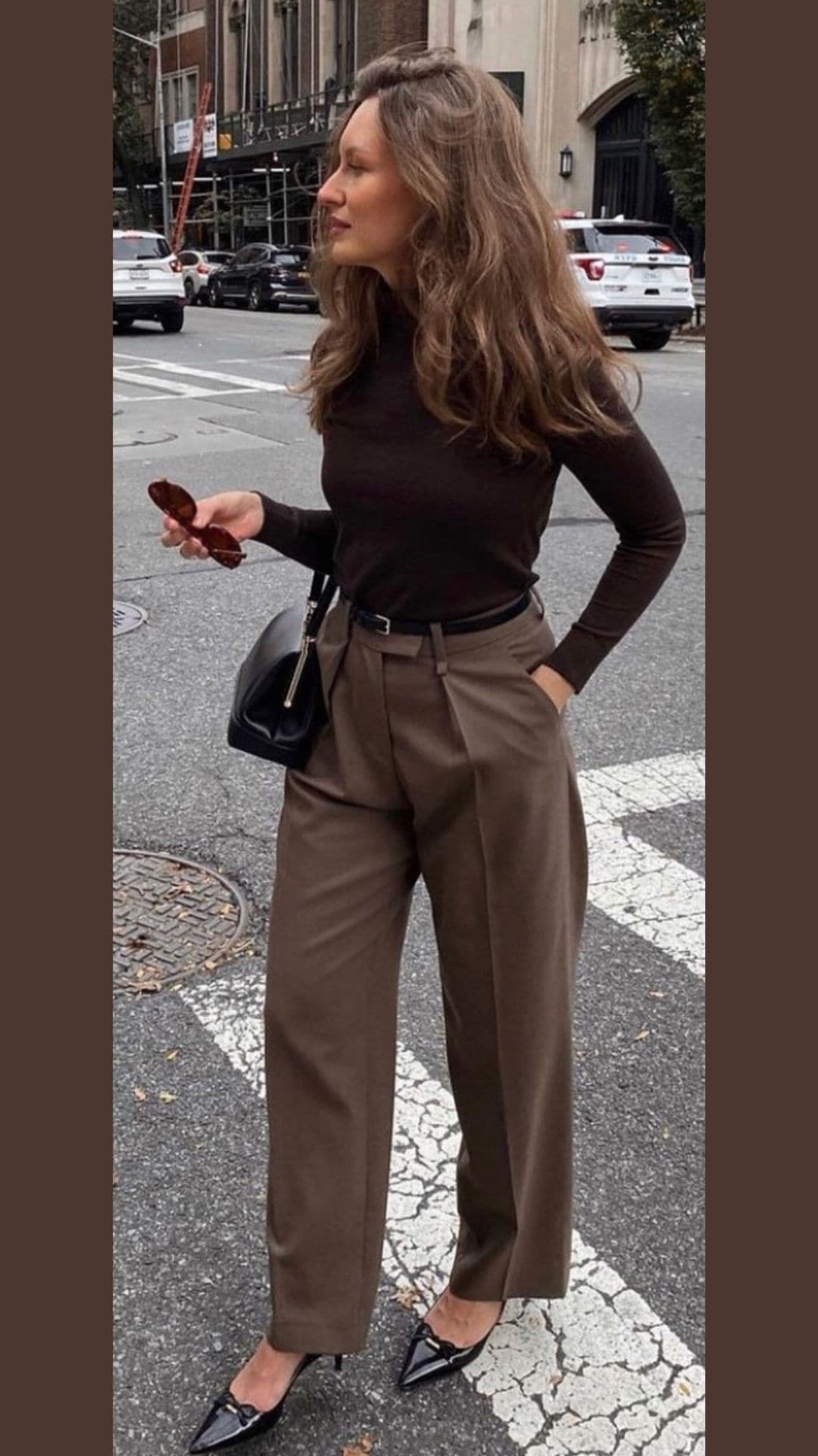 Paired with a slouchy brown bag and sleek black shoes, this ensemble balances chic style with comfort, highlighting the versatility of brown in fashion.
