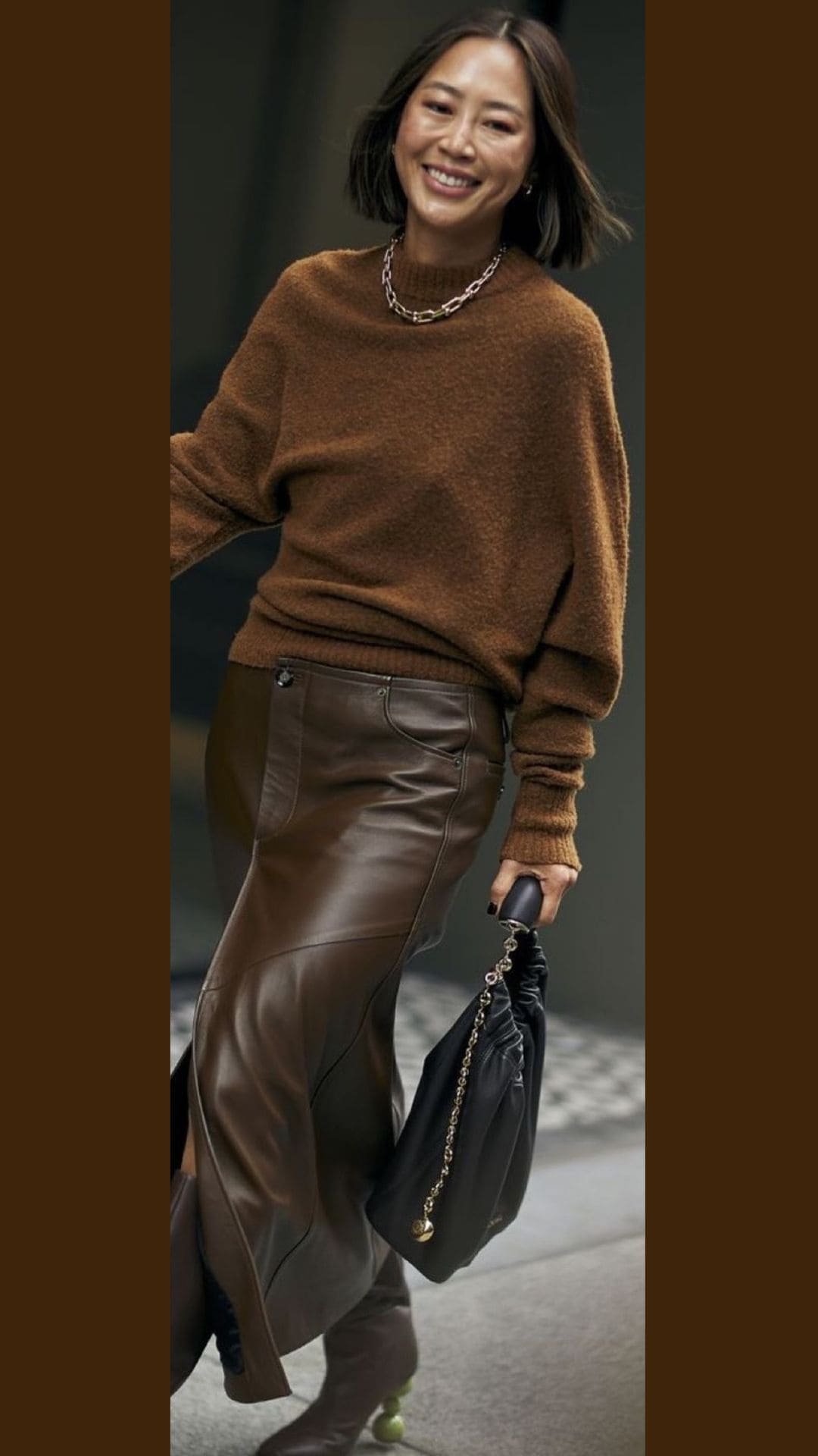 This ensemble exudes a polished sophistication with its cozy oversized brown sweater, perfectly balanced by a sleek high-waisted leather skirt.