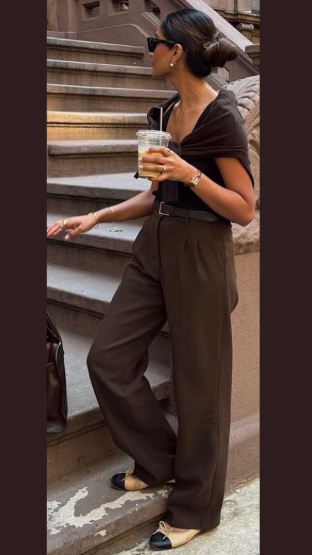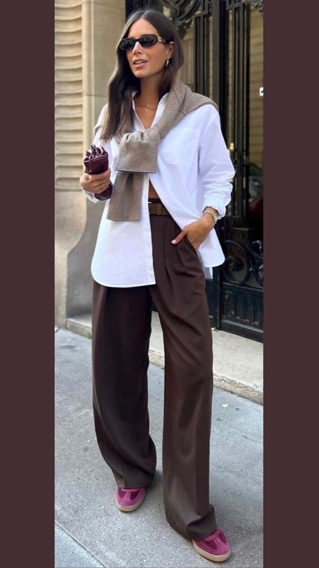 This outfit elegantly combines a pair of wide-leg brown trousers, offering an effortlessly chic silhouette.