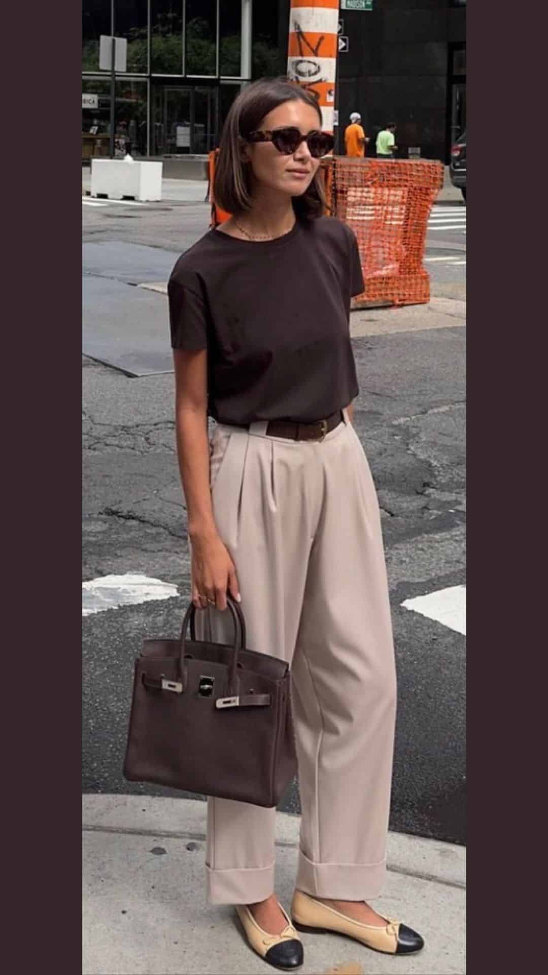 Accessorized with a structured dark brown handbag and classic two-tone flats, this outfit strikes a balance between elegance and comfort.