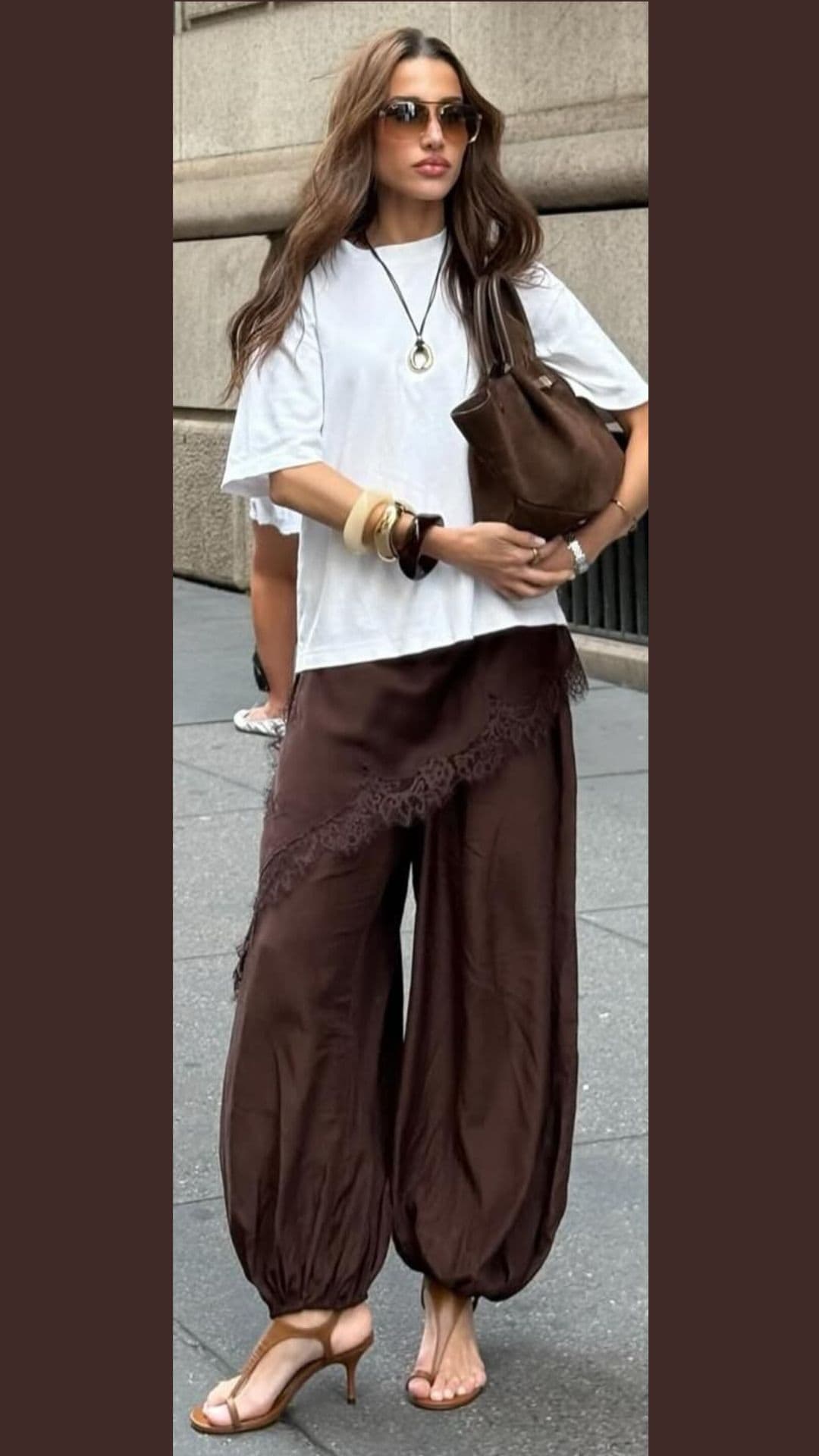 This casual yet chic brown outfit features loose trousers adorned with delicate lace trim that adds a subtle touch of sophistication.