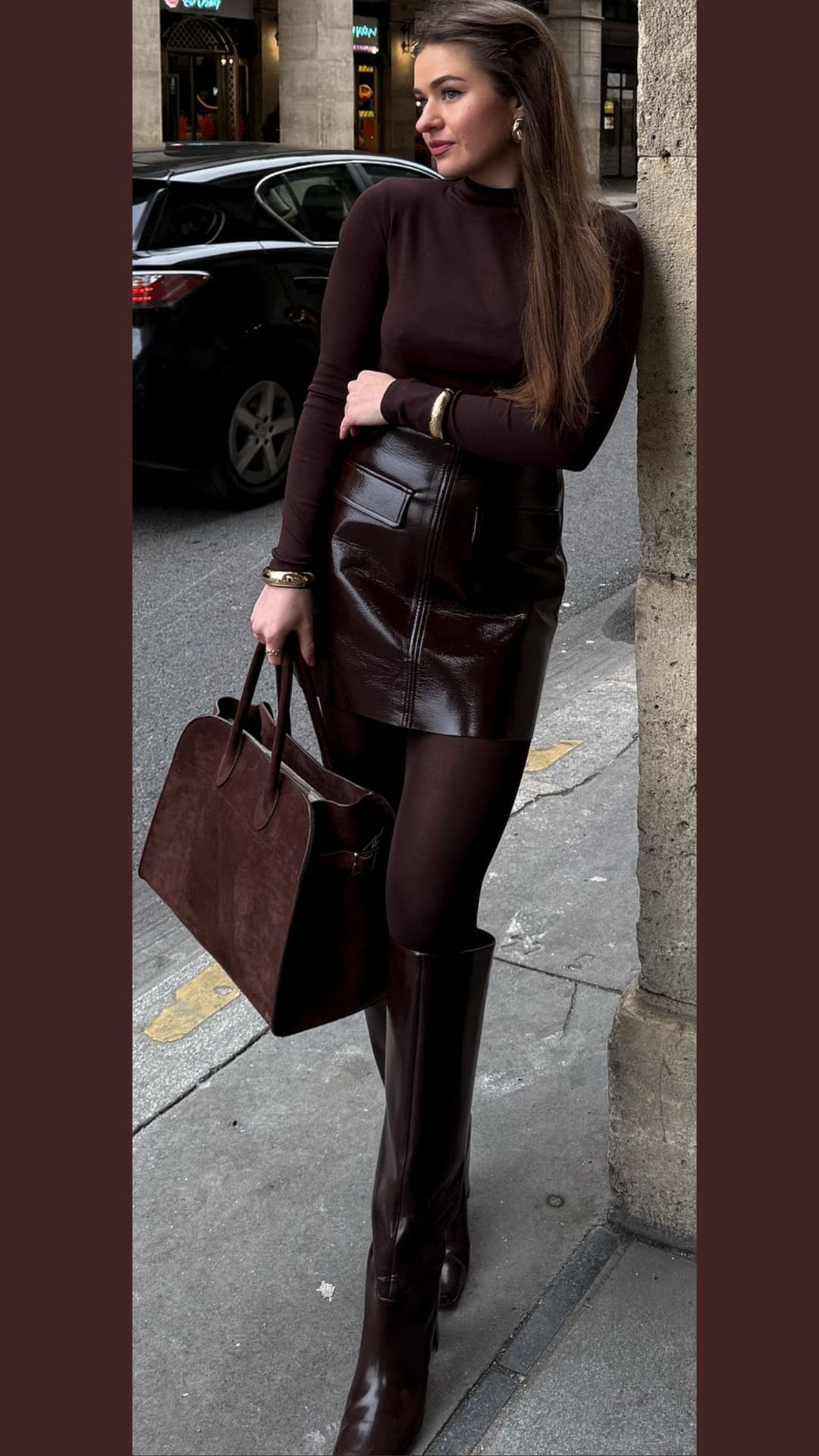 This brown outfit radiates elegance with its fitted long-sleeve top and high-waisted leather mini skirt.