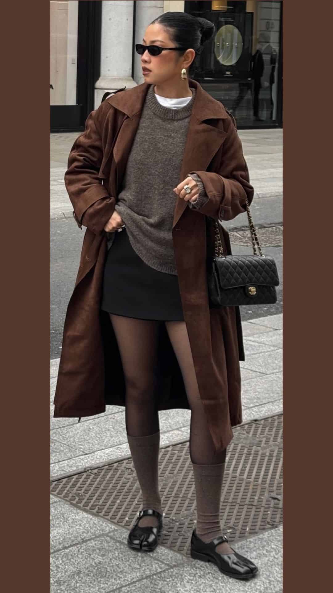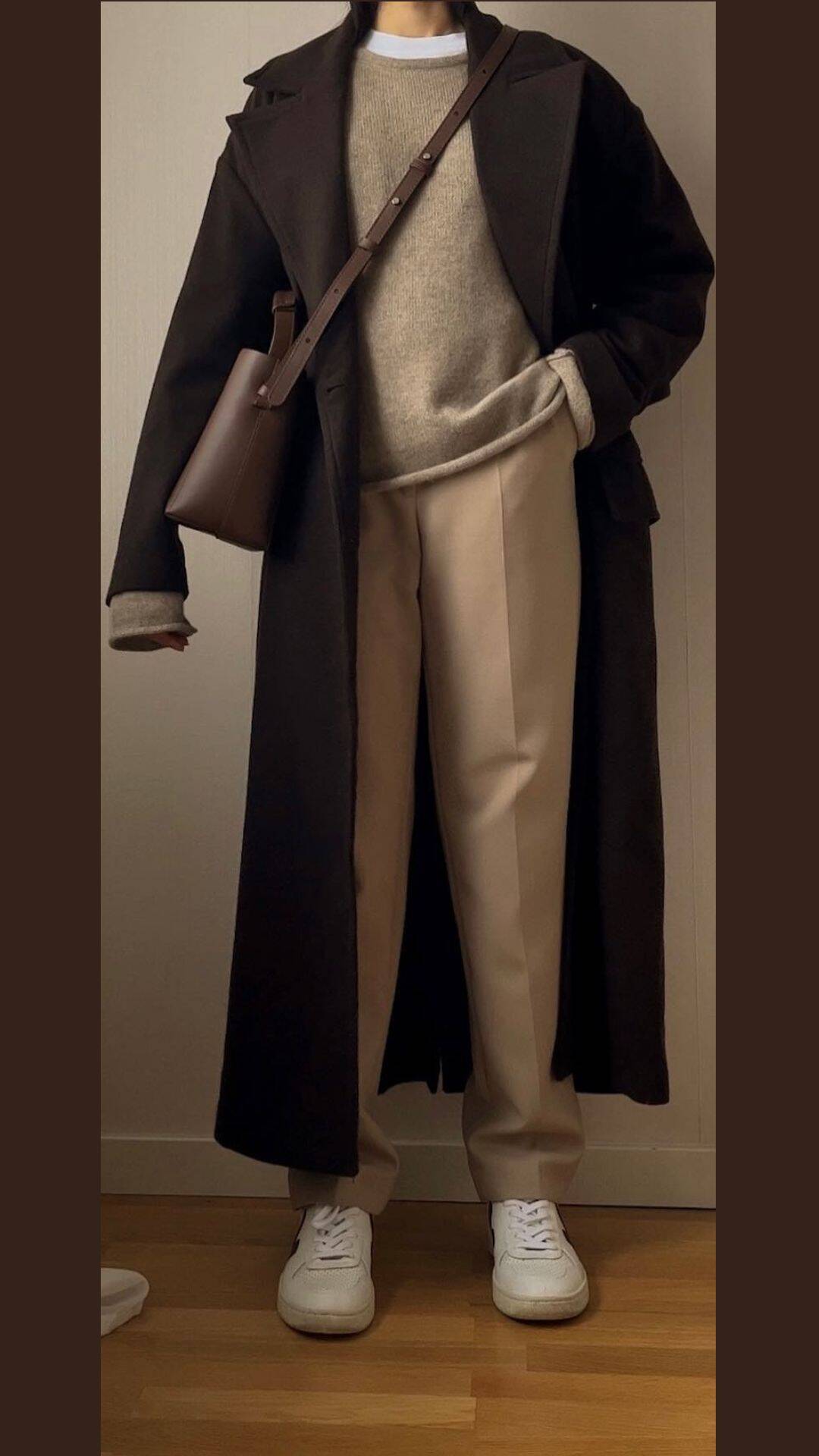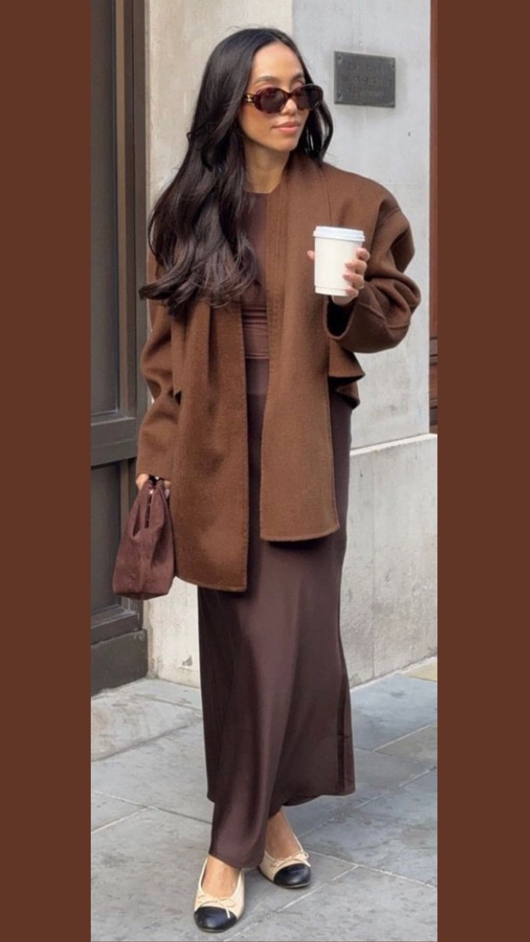The outfit features a rich, warm brown palette that radiates sophistication, anchored by a cozy oversized coat that adds dimension.