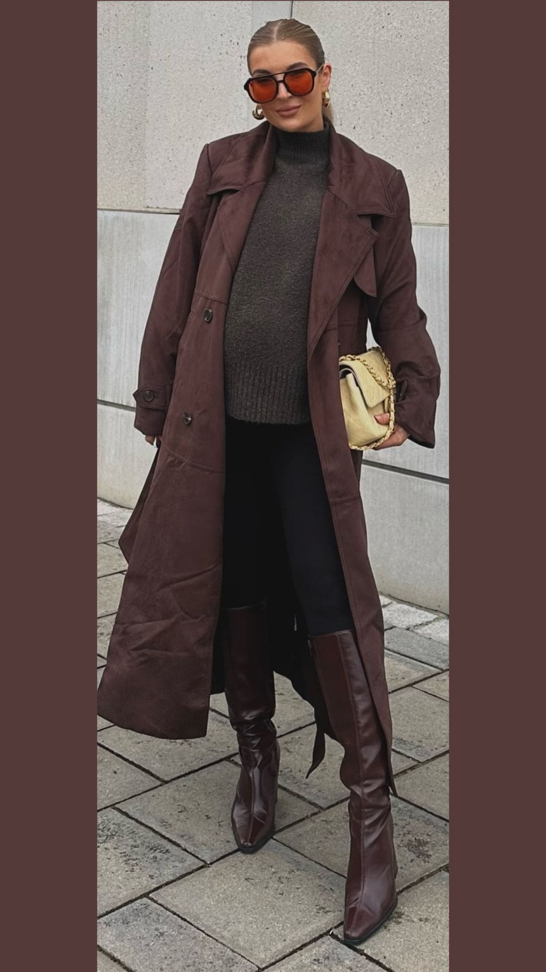 This brown outfit features a beautifully tailored suede coat that adds an air of sophistication.