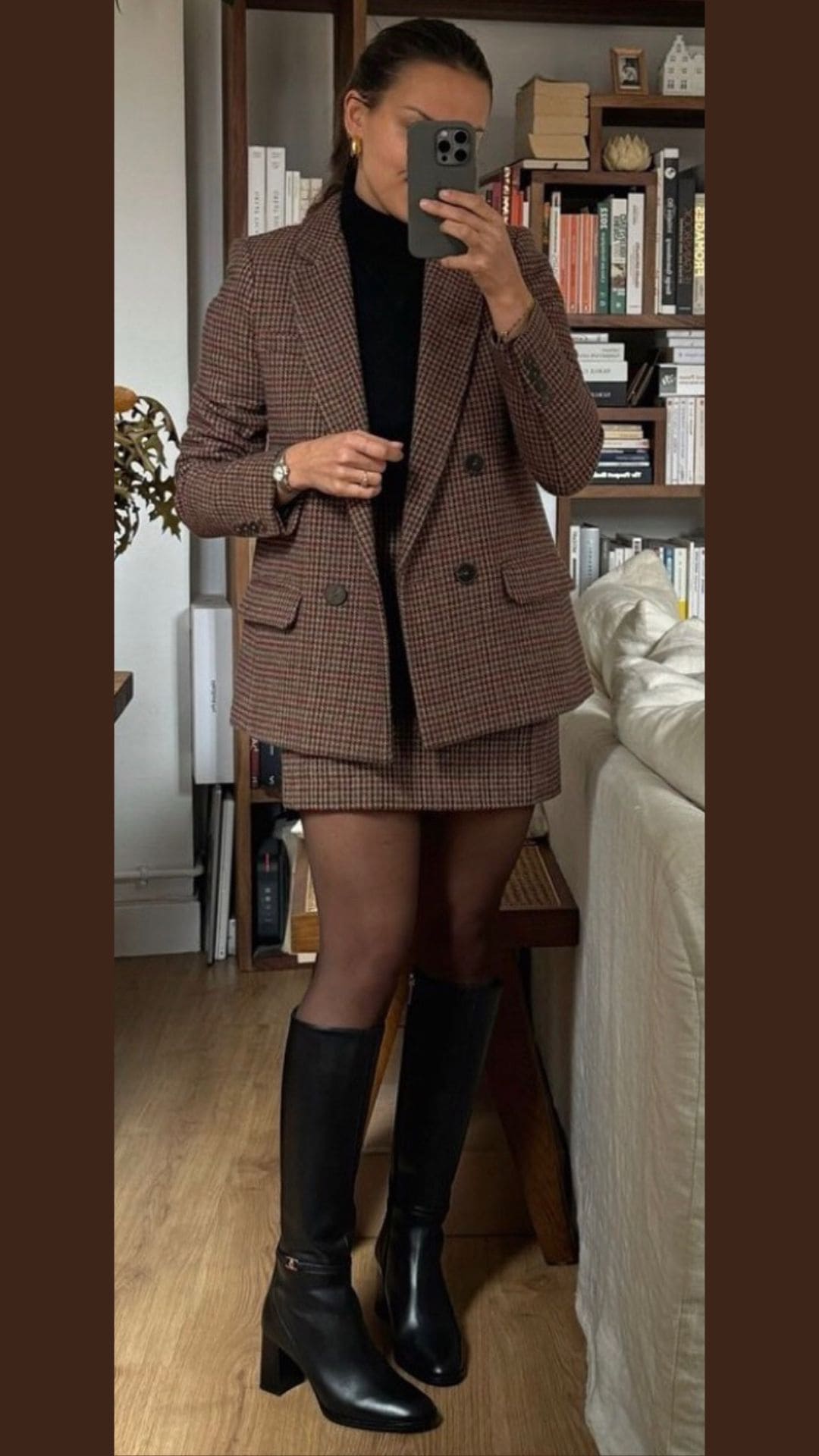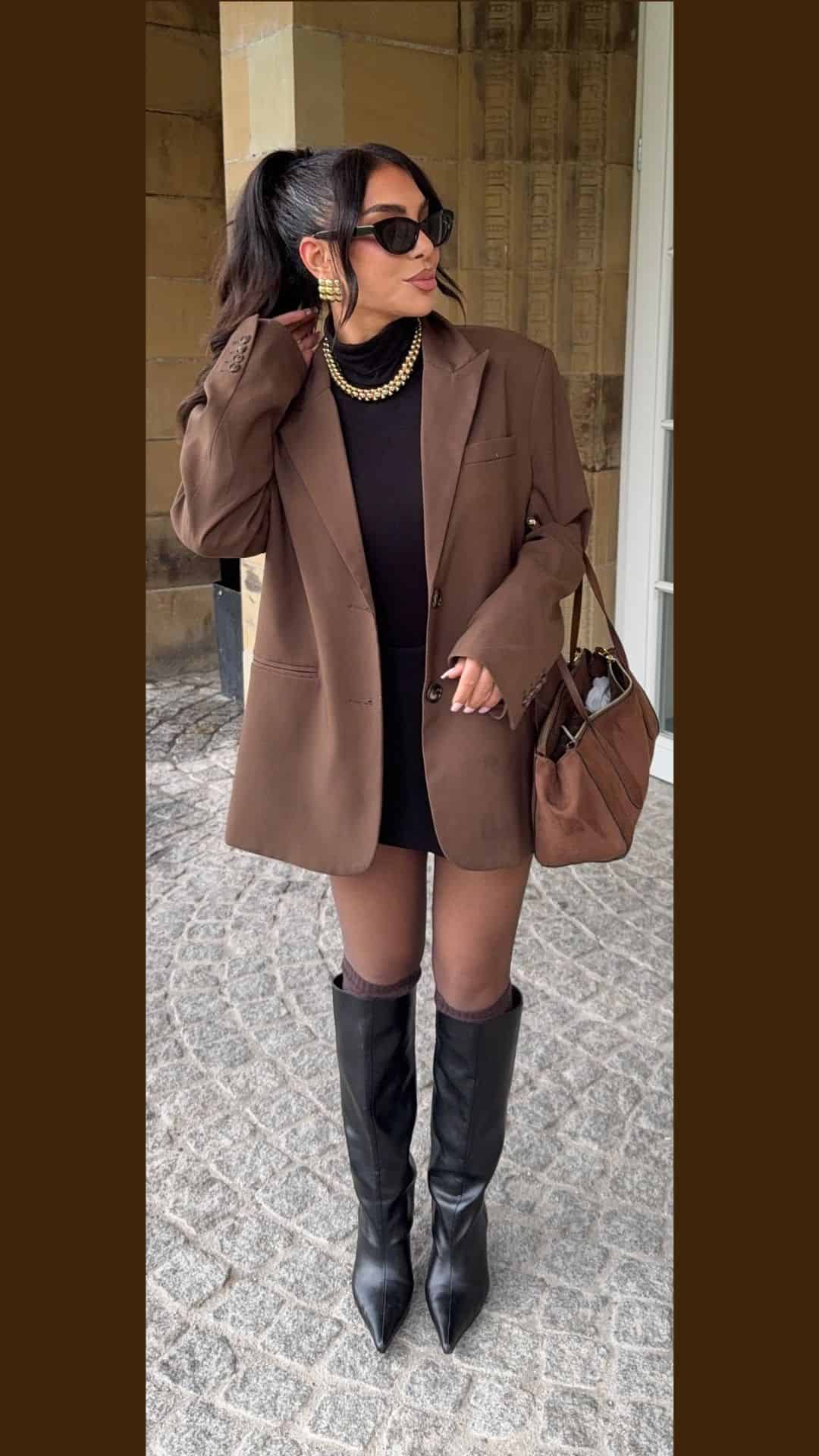 The combination of varying shades of brown creates a harmonious look, perfectly balanced by the modern simplicity of black accessories.