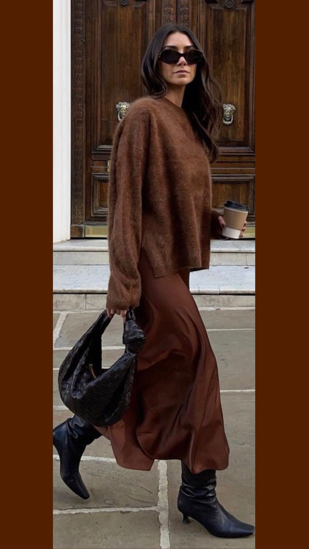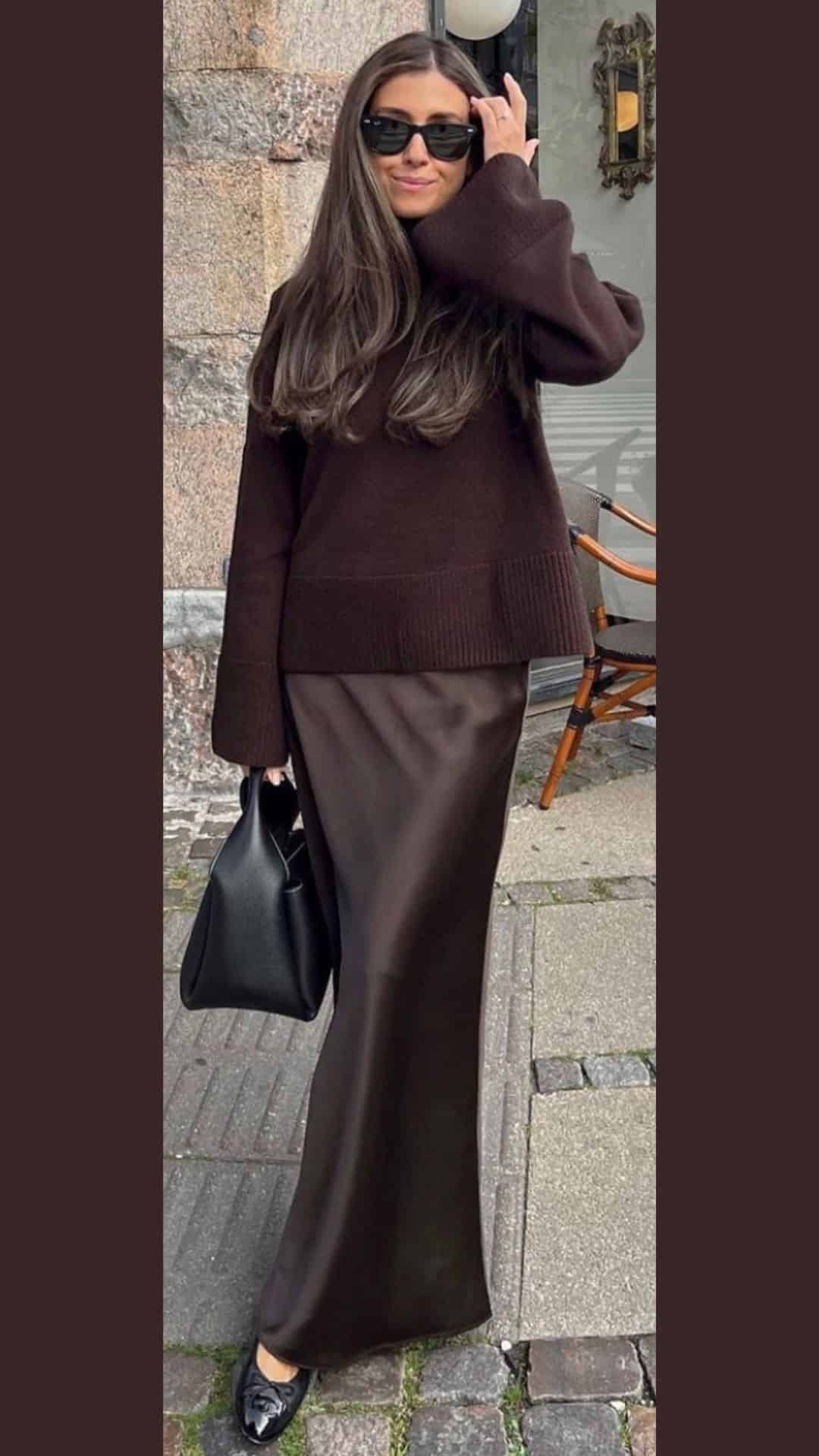 The dark brown sweater drapes effortlessly over the sleek satin maxi skirt, creating a seamless silhouette.