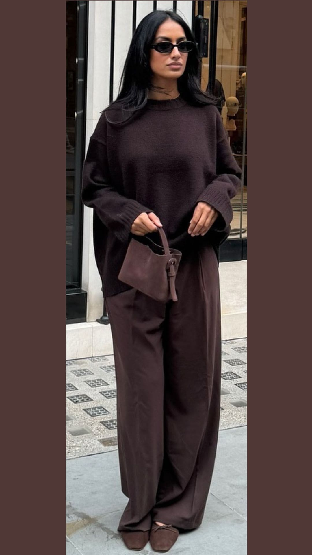 This brown outfit features a cozy, oversized dark brown sweater that exudes comfort and style.