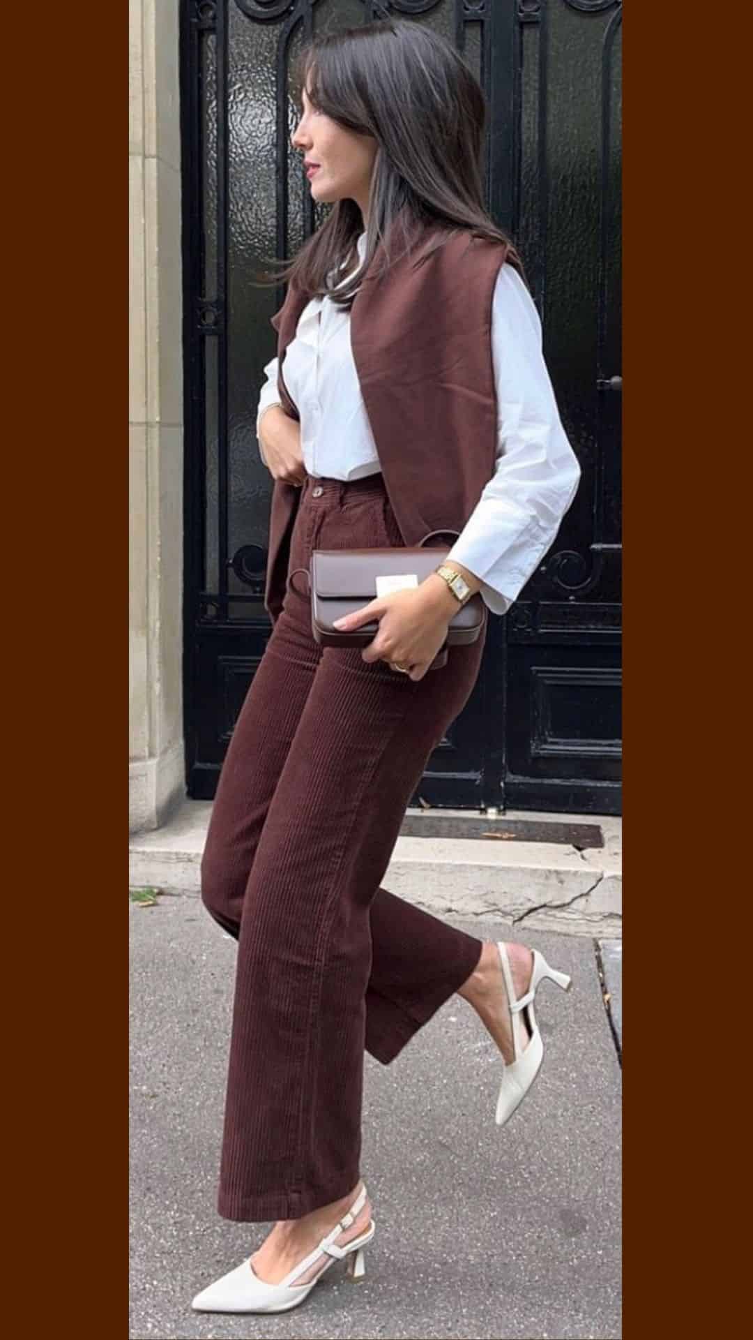 This effortlessly stylish brown outfit combines tailored wide-leg trousers and a fitted white top, creating a flattering silhouette.