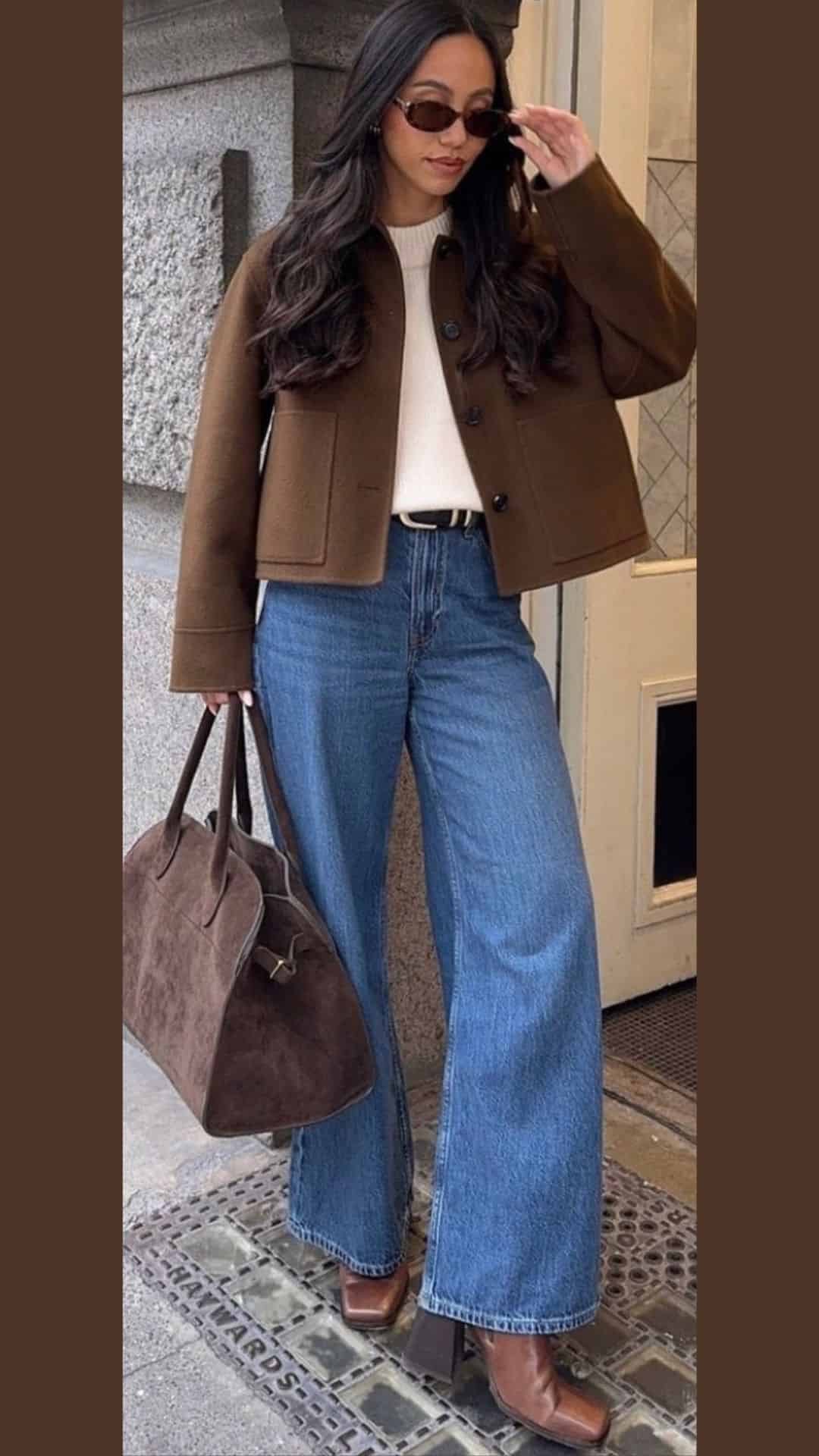 High-waisted light blue wide-leg jeans add a contemporary touch, while brown heeled boots and an oversized bag enhance its versatility.