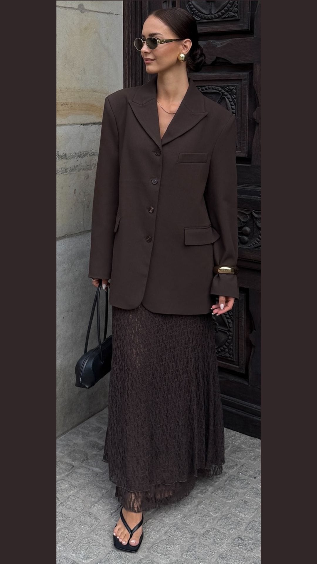 This outfit exudes sophistication, featuring a tailored brown blazer layered over a translucent brown maxi dress that flows elegantly.