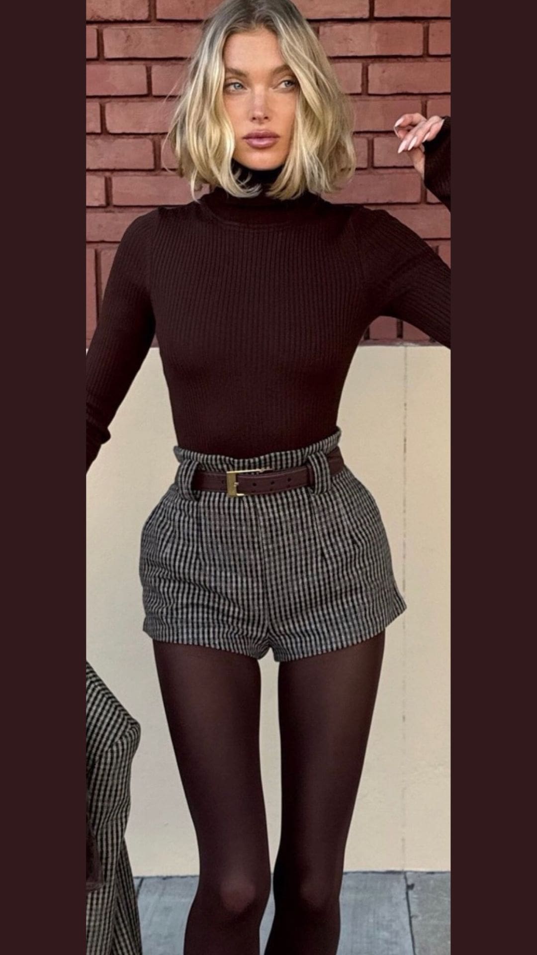 This outfit embodies sophistication with its rich chocolate-brown ribbed turtleneck, elegantly tucked into classic houndstooth shorts.
