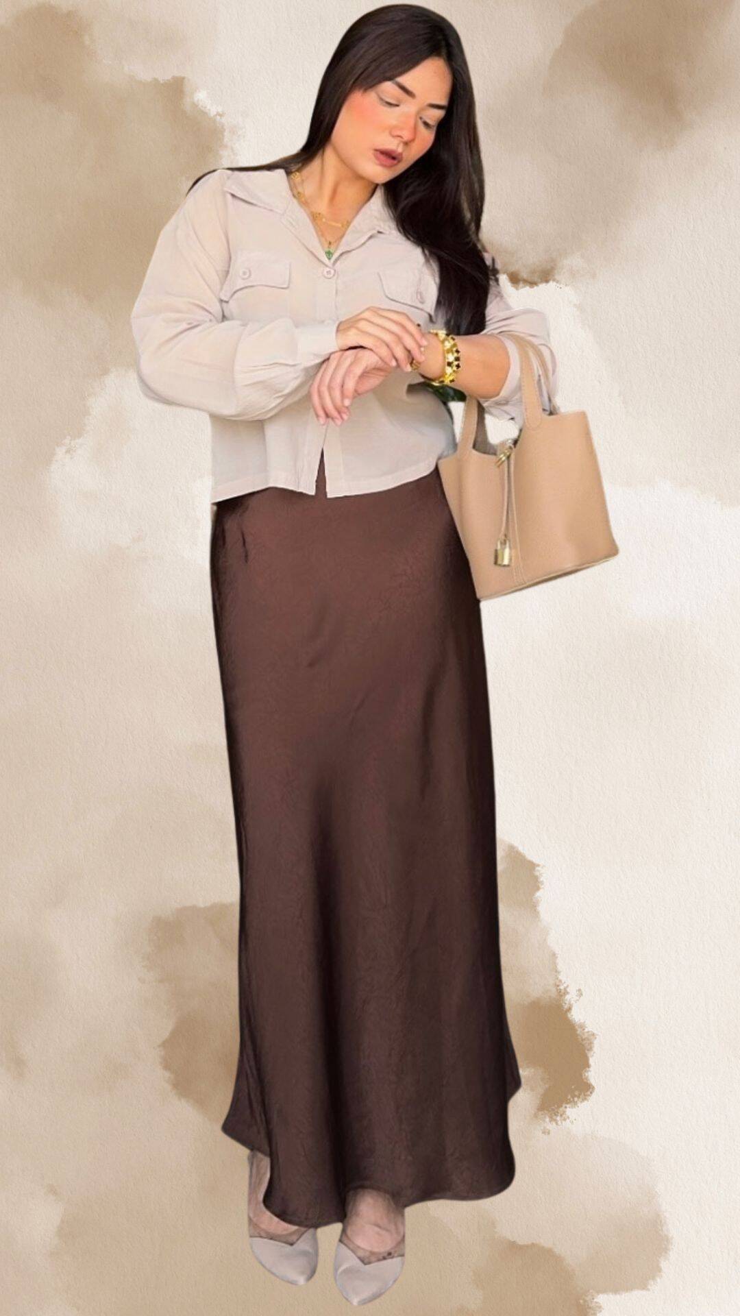 This sophisticated ensemble showcases a sleek brown satin midi skirt, offering a beautiful flow and movement.