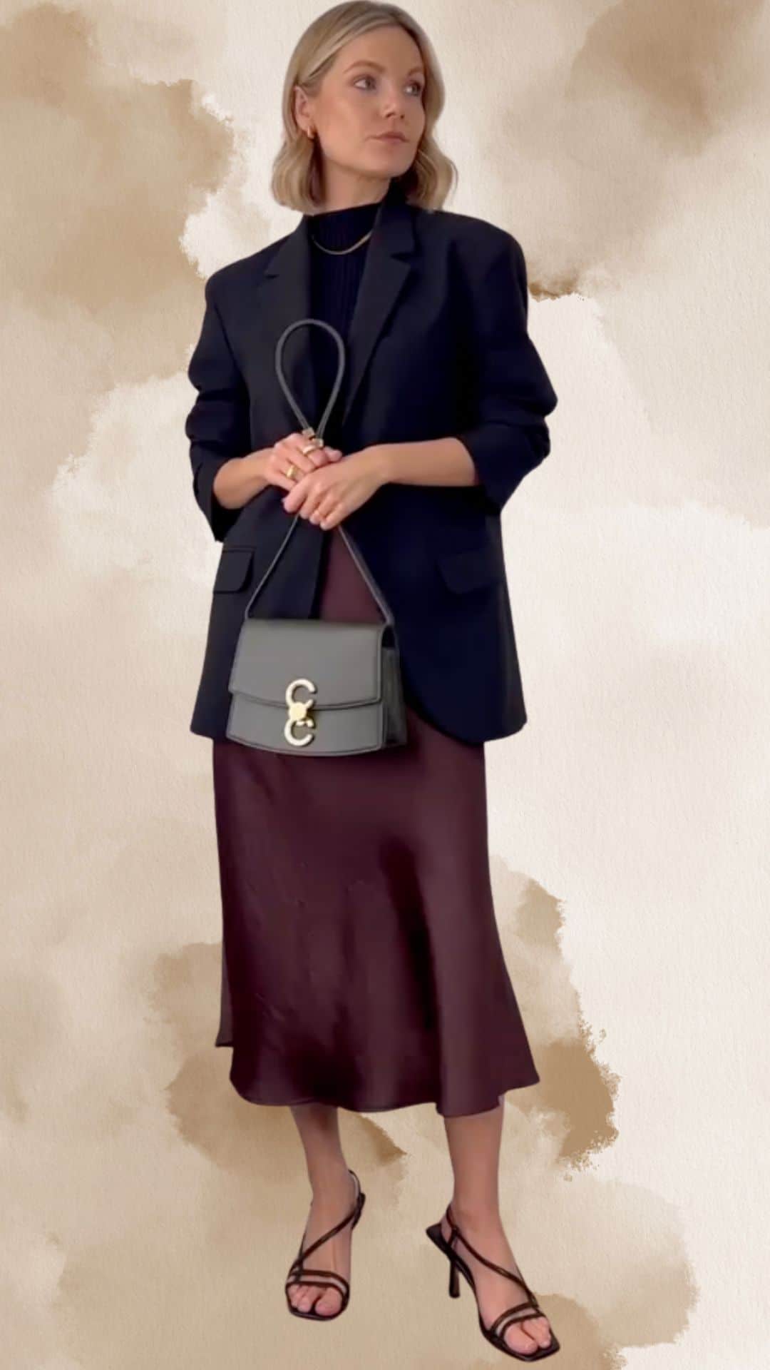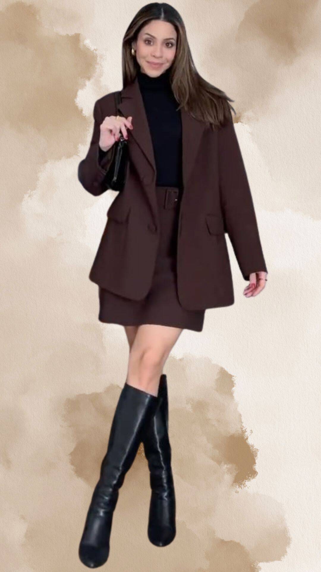 The deep chocolate hues of the midi skirt and fitted top create a unified look, while the structured blazer adds a touch of elegance.