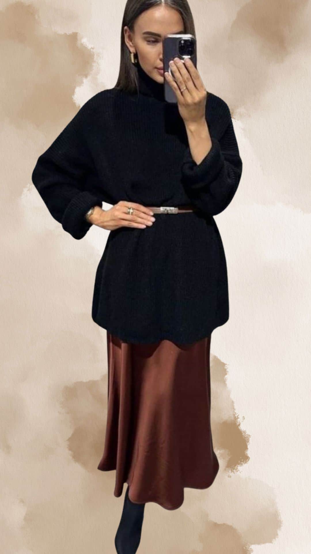 This stunning brown skirt outfit combines a loose-fitting black knit sweater with a flowing satin brown skirt, perfect for creating a sophisticated look.