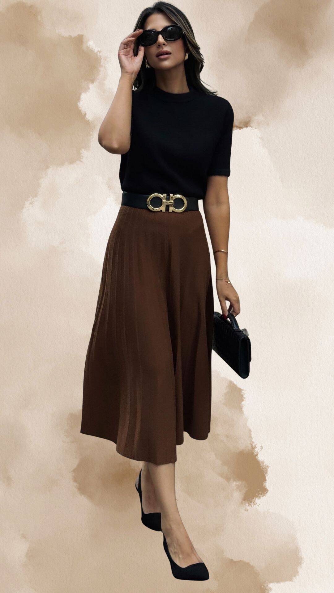 A simple gold necklace and a small black handbag complete the outfit, making it a perfect choice for women seeking brown skirt outfit ideas that exude chic confidence.