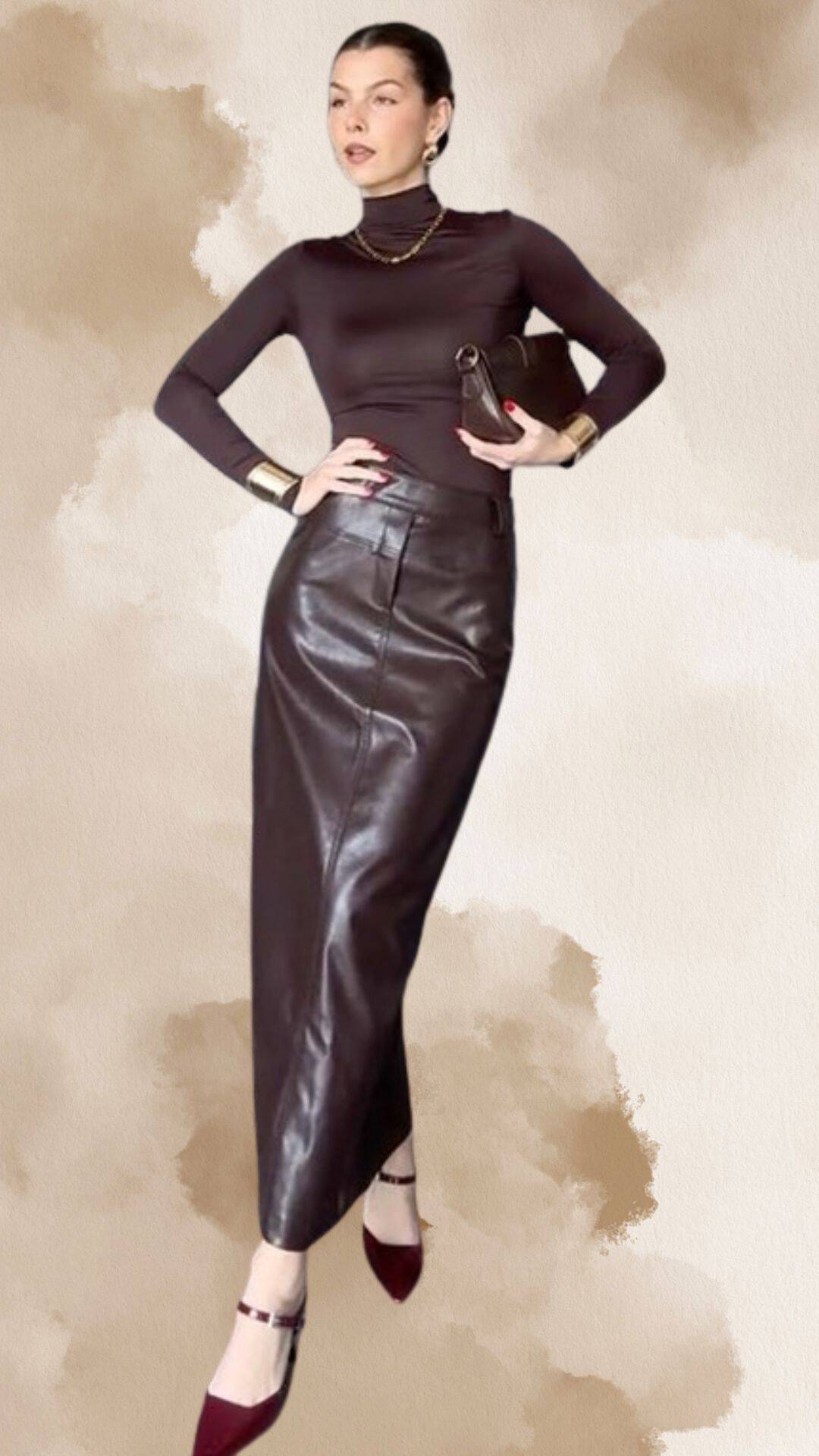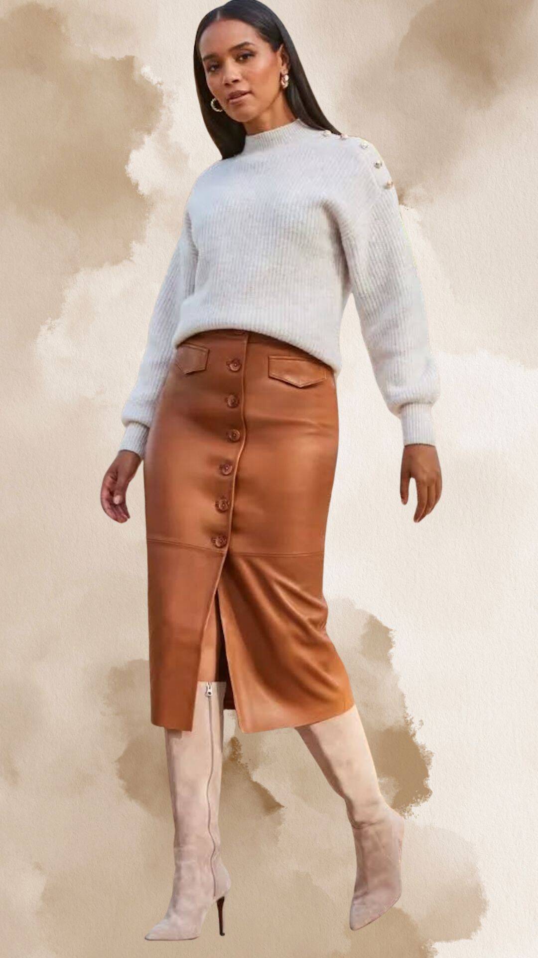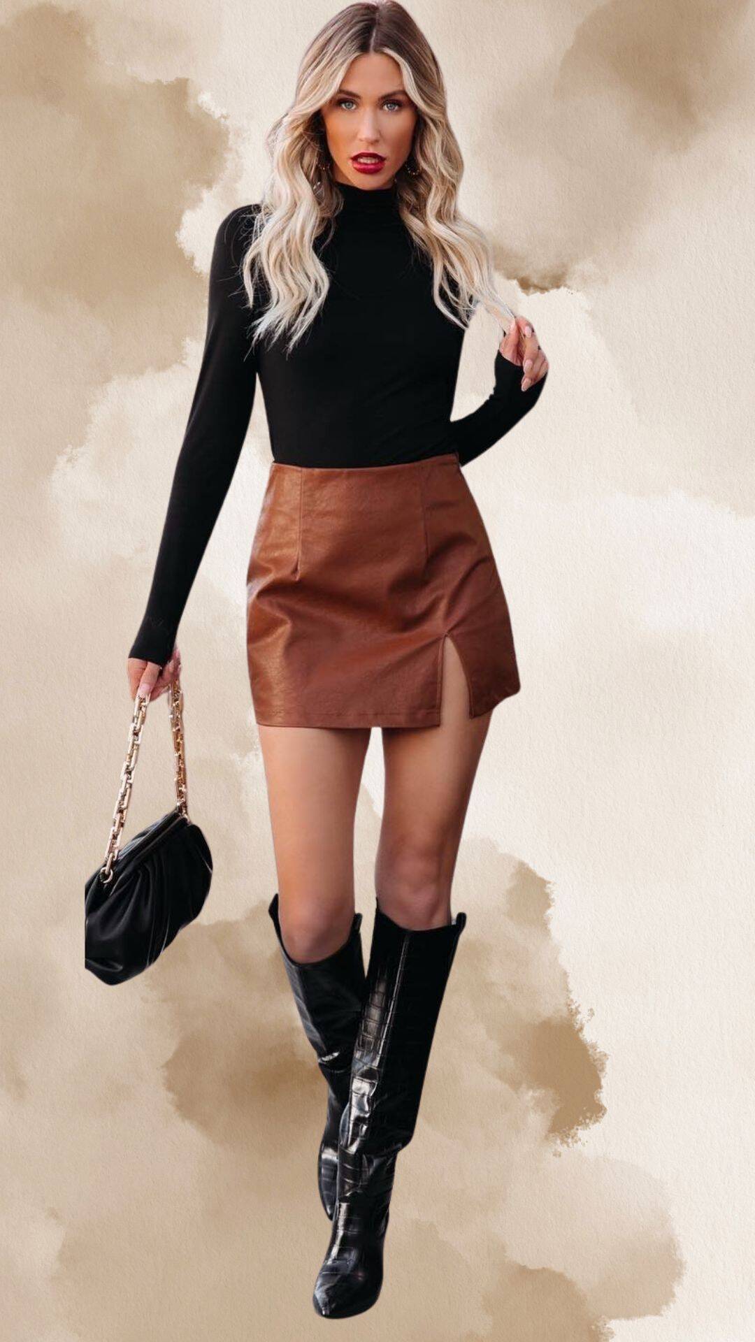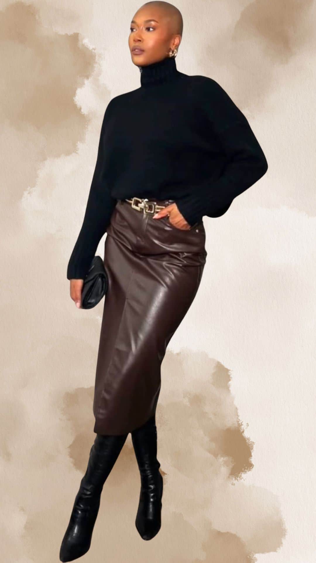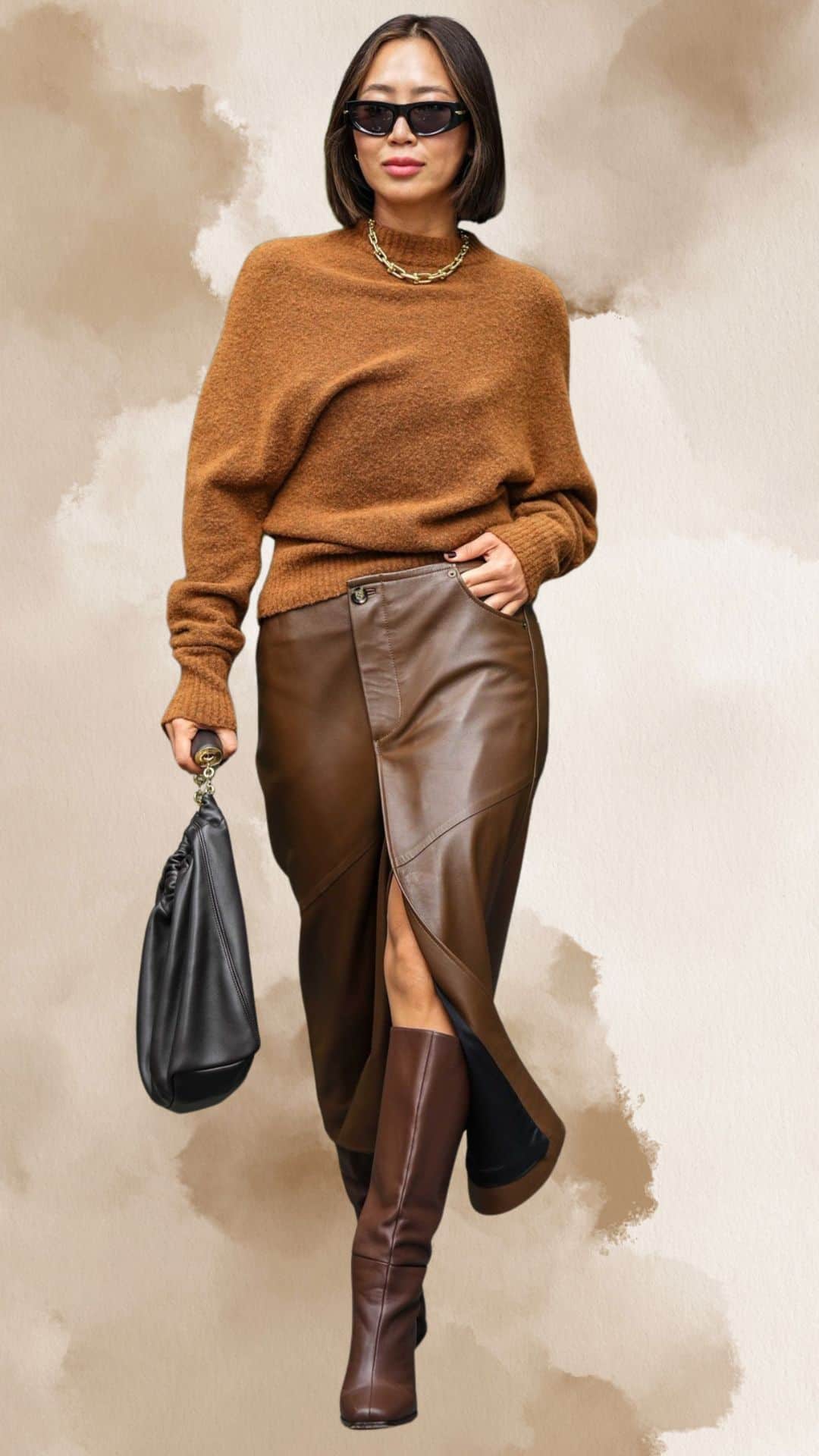And when you want to add edge and sophistication, nothing beats a leather skirt outfit in chocolate or cognac hues.