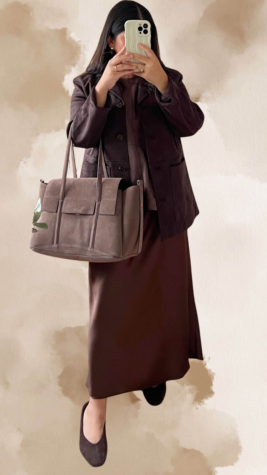 Perfect for various occasions, this outfit idea inspires women to mix and match browns while playing with elegant shapes and textures from their own wardrobes.