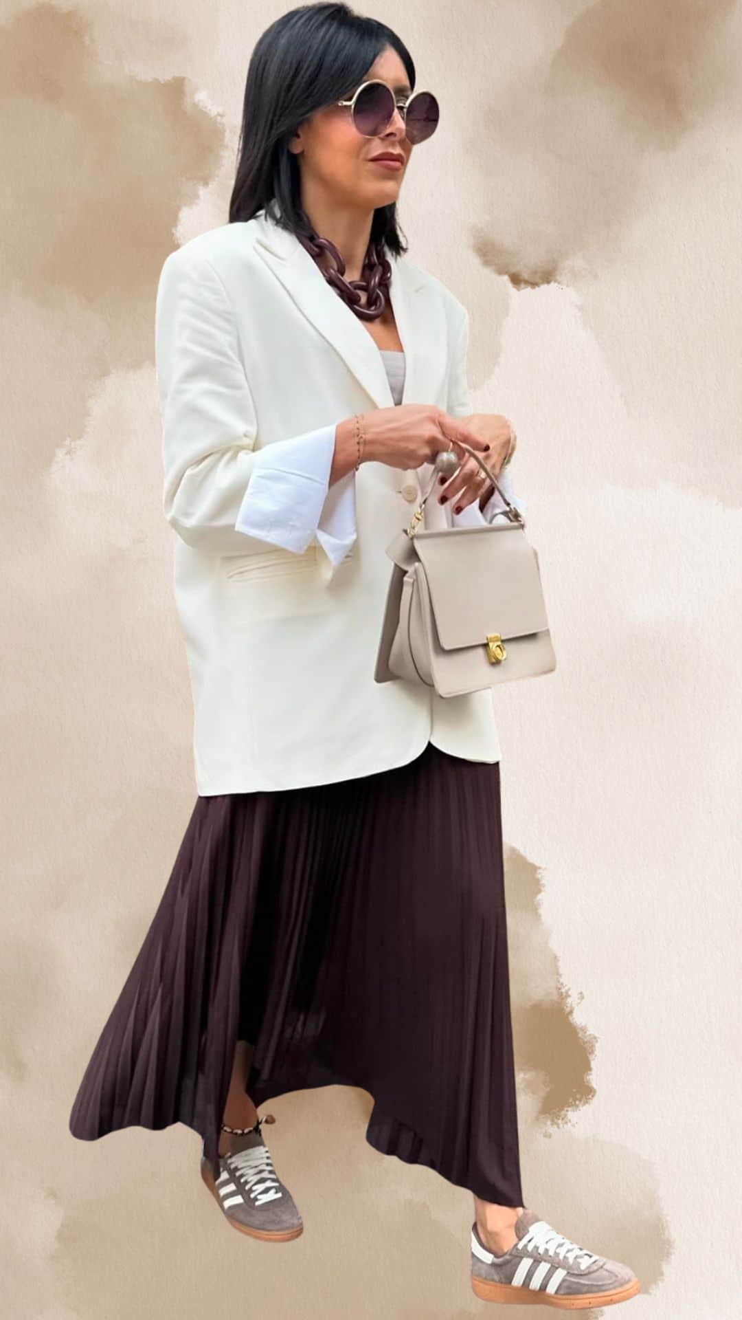 The flowing, pleated dark brown skirt pairs beautifully with a tailored white blazer, showing how contrasts can elevate your look.