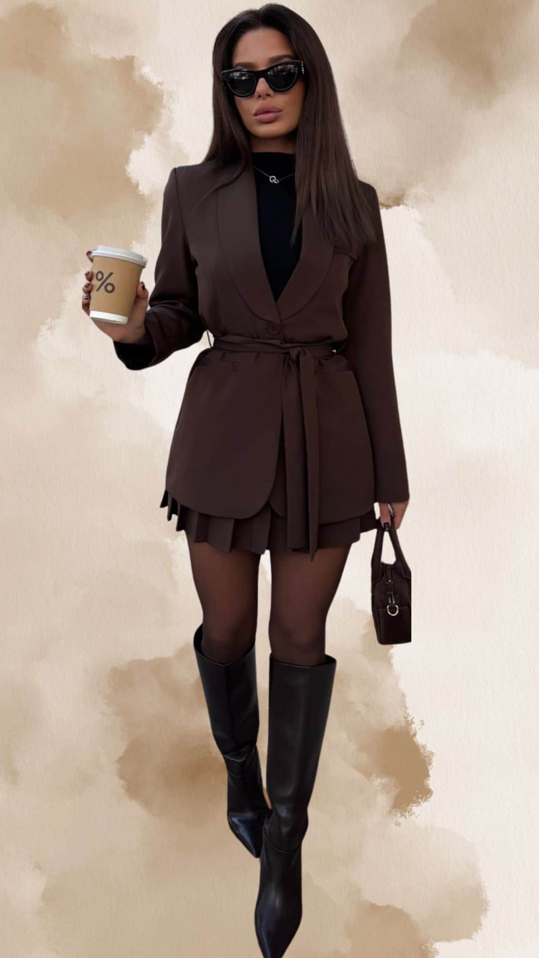 This stylish brown skirt outfit combines a tailored blazer and a matching pleated mini skirt, perfect for making a fashion statement.